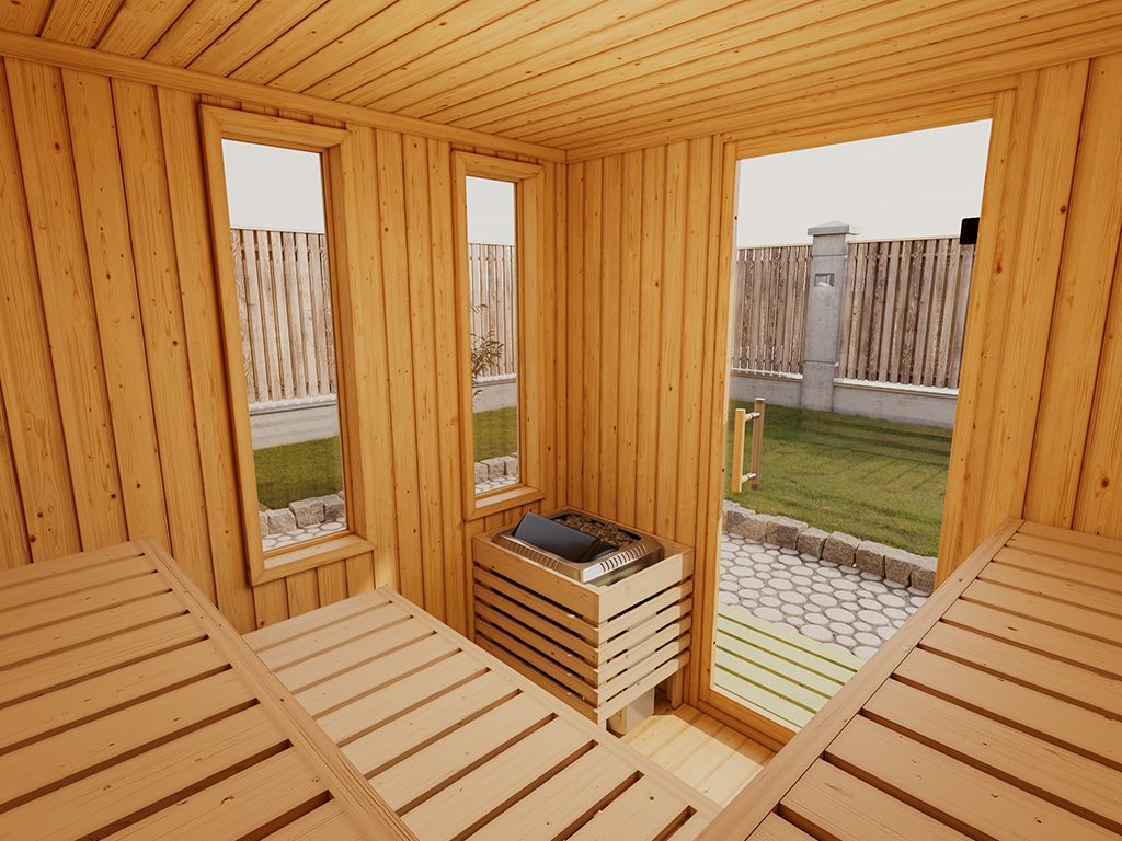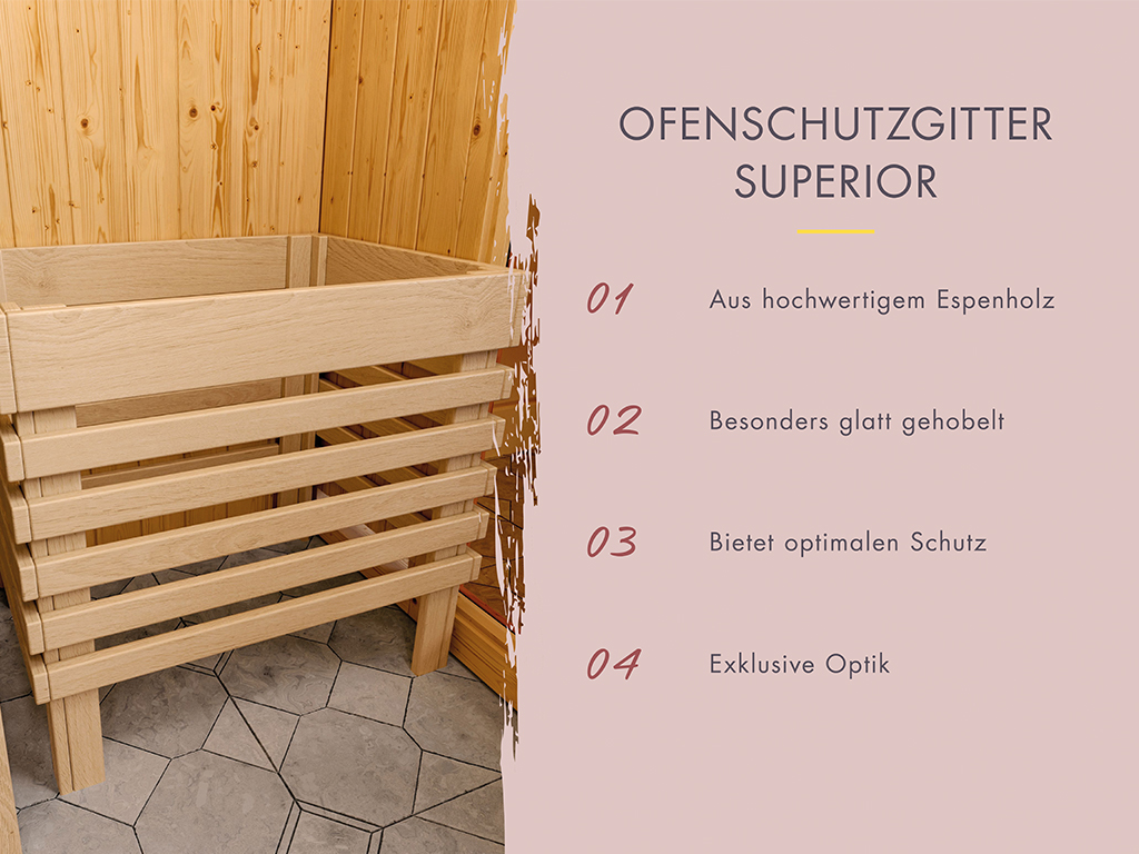 - Bodenrost aus fußwarmem Fichtenholz: für angenehmes Auftreten innerhalb und außerhalb der Sauna.
