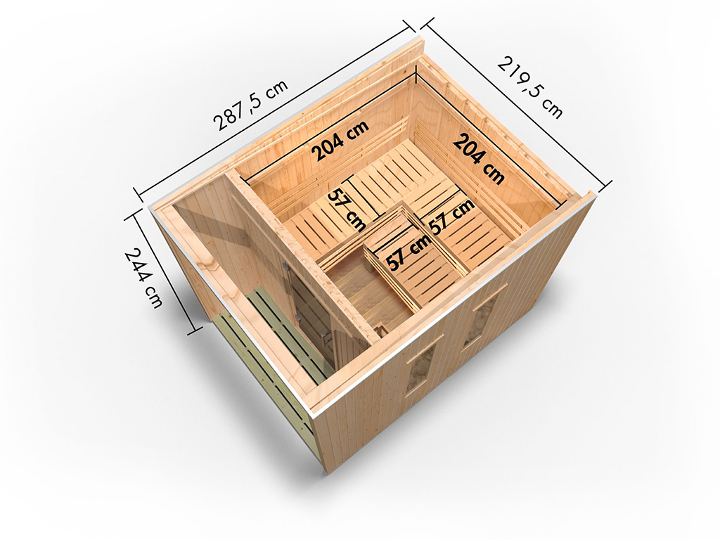 - Bitte beachten: Im Lieferumfang dieser Sauna ist KEIN Saunaofen enthalten. Von dieser Sauna sind jedoch Varianten inkl. Saunaofen erhältlich (siehe oberhalb des Warenkorb-Buttons). Zusätzlich findest du im Onlineshop eine große Auswahl an verschiedenen Öfen.