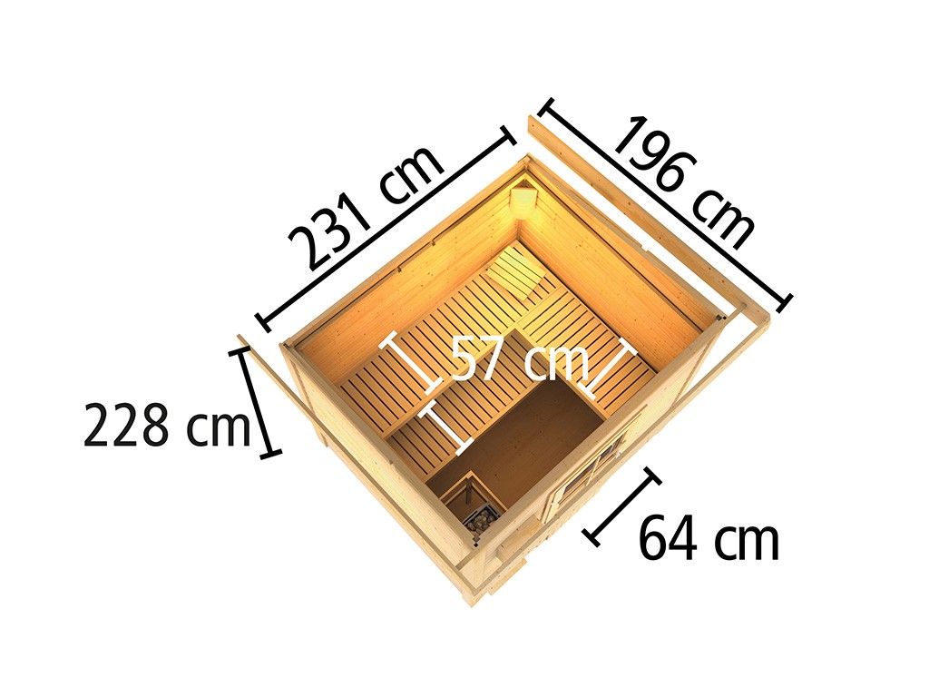 B x T x H: 231 x 196 x 238 cm, inkl. 3 Liegen, inkl. 9 kW Saunaofen + ext. Steuerung
