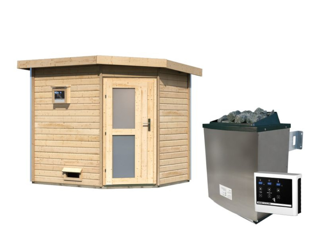 Saunahaus Mikka mit Milchglastür, inkl. 9 kW Bio-Kombiofen mit externer Steuerung