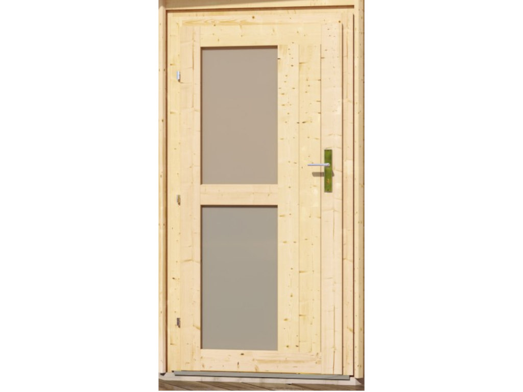 Die drei stabilen Bankliegen aus Espenholz erhöhen den Komfort in diesem Saunahaus. Zusätzlich ist ein Ofenschutzgitter aus massivem Fichtenholz und ein Massivholzboden im Lieferumfang enthalten. Die Mineralwolldämmung in der Saunadecke sorgt zusätzlich für einen niedrigen Energieverbrauch. Inklusive Montageanleitung. - Milchglas Holztür