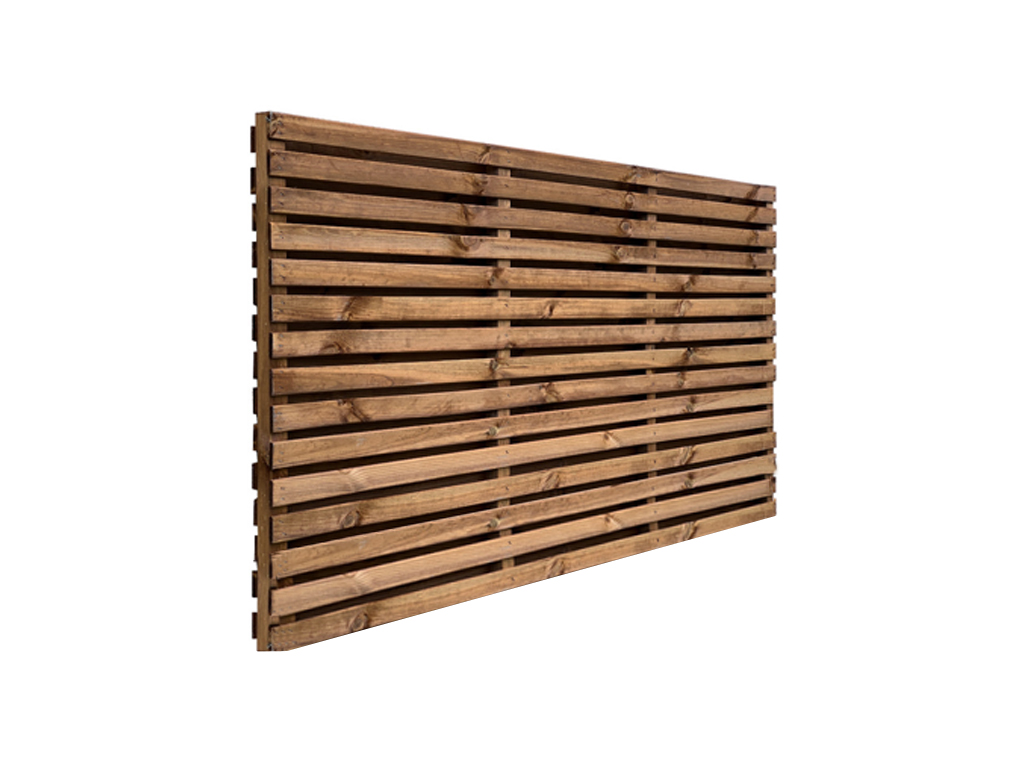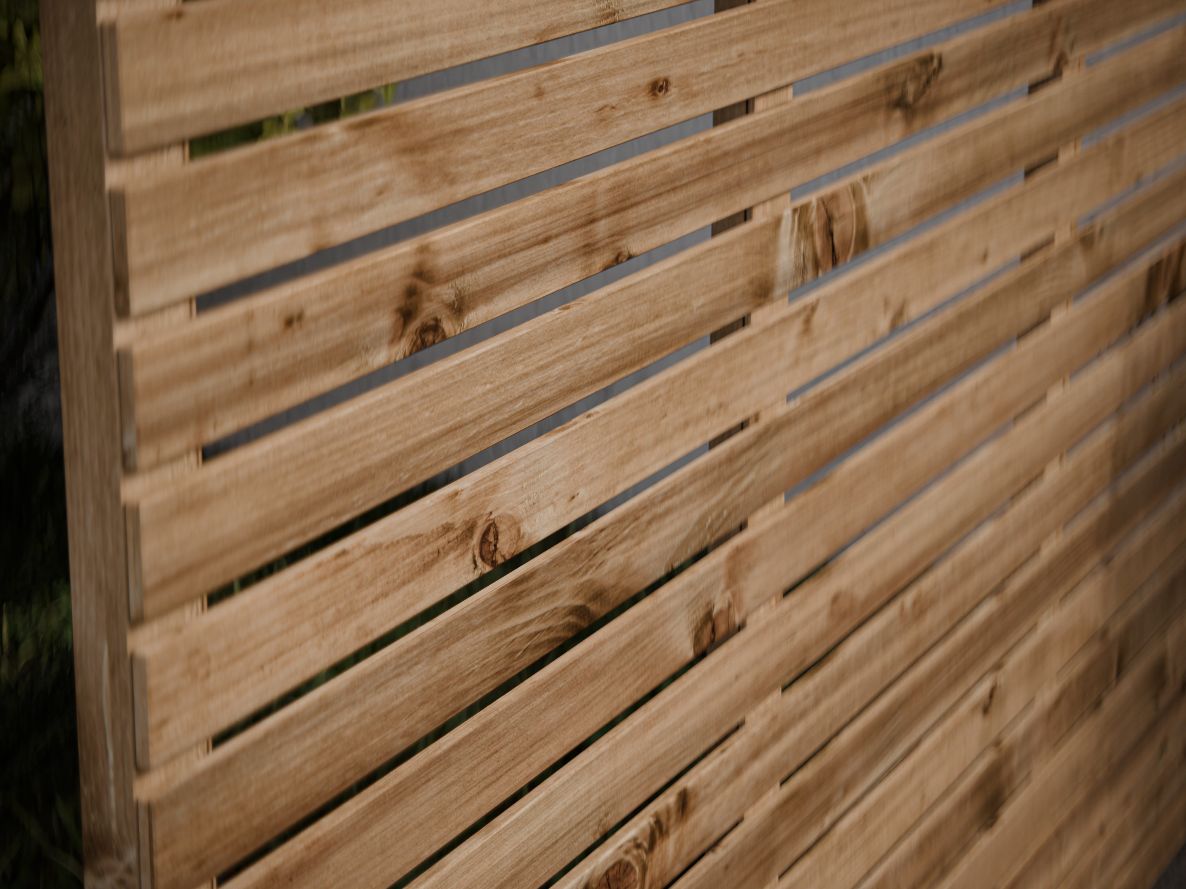 Dieses Modell ist aus hochwertigem Kiefernholz hergestellt. Kiefer ist leicht zu bearbeiten und besitzt eine gleichmäßige gerade Faserstruktur. Auch ist Kiefernholz dank kurzer Transportwege das preiswerteste heimische Holz. Der Sichtschutzzaun ist mit der wasserlöslichen Lasur Aosta Kastanie vorlasiert. Diese verhält sich ähnlich wie eine Grundierung und bietet einen Grundschutz z. B. vor Feuchtigkeit. Zusätzlich verleiht sie dem Zaun einen besonders hochwertigen Look. Je nach Witterung sollte eine Nachbehandlung mit einer Lasur erfolgen.