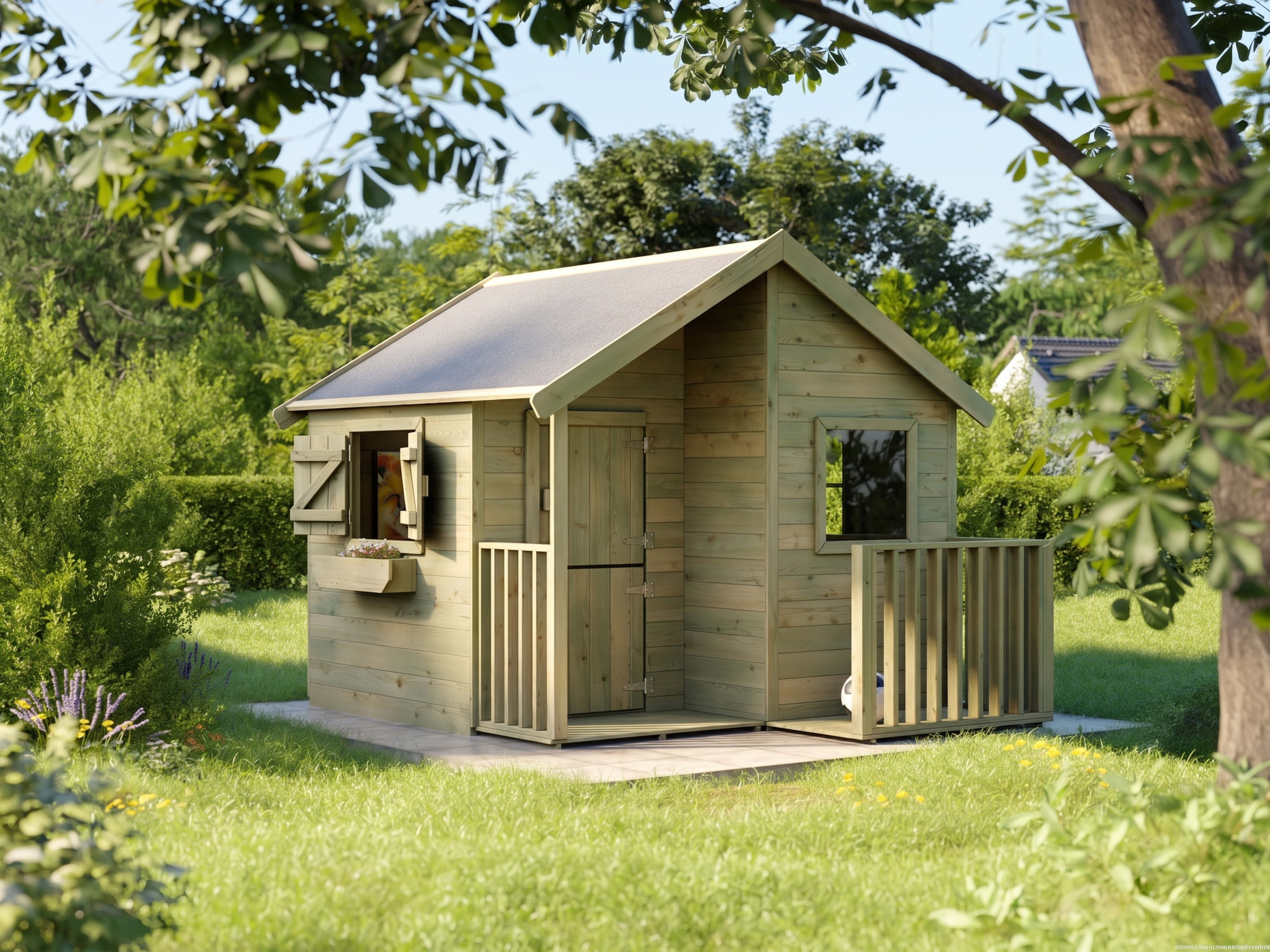 Das Spielhaus mit Veranda wird mit Einzeltür und 3 Fenstern geliefert und sorgt für großes Spielvergnügen bei den Kindern.