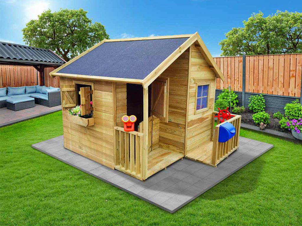 Das Spielhaus sollte auf einen geeigneten, ebenen Untergrund platziert werden, keinesfalls direkt auf den Rasen. Dauerhafte Nässe von unten ist unbedingt zu vermeiden. Lies hierzu unseren Ratgeber und nimm für den Aufbau immer die mitgelieferte Montageanleitung zur Hand.