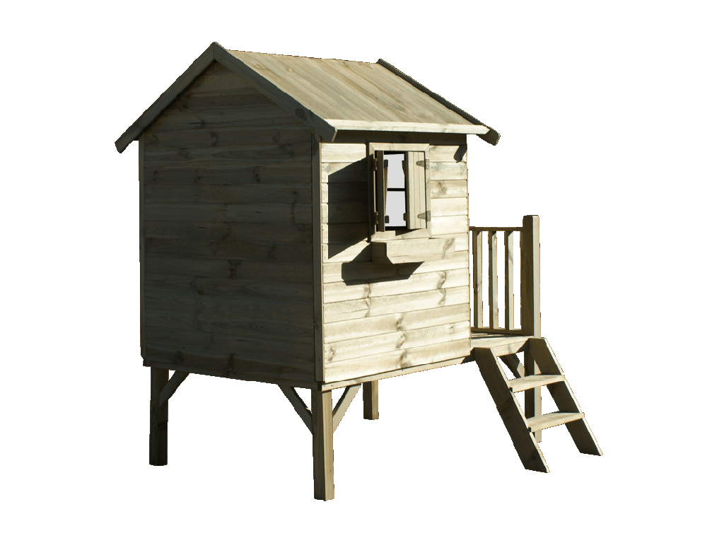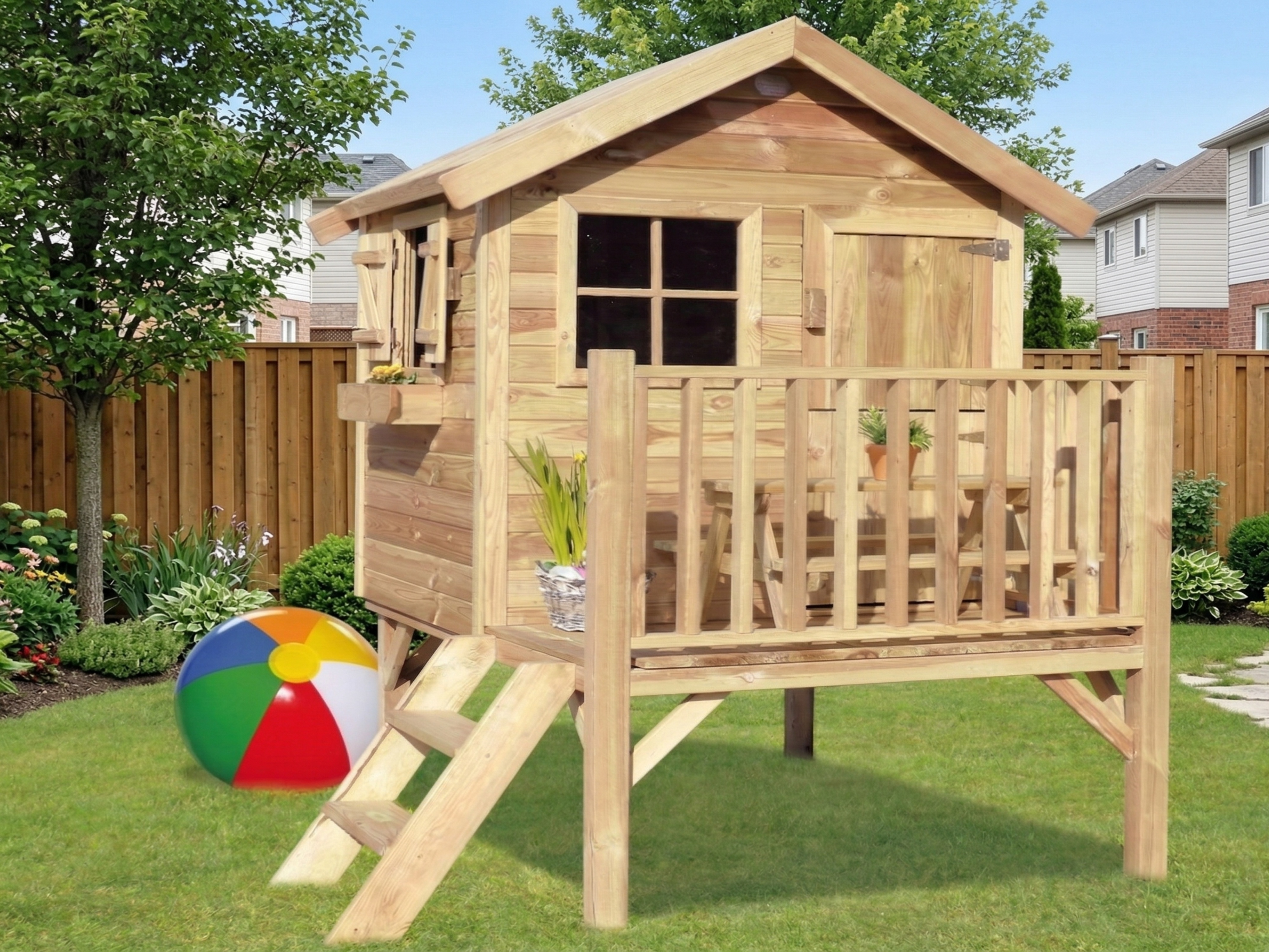 Das Stelzenhaus wird mit Einzeltür, 2 Fenstern, Treppe und einem Blumenkasten geliefert und sorgt für großes Spielvergnügen bei den Kindern.