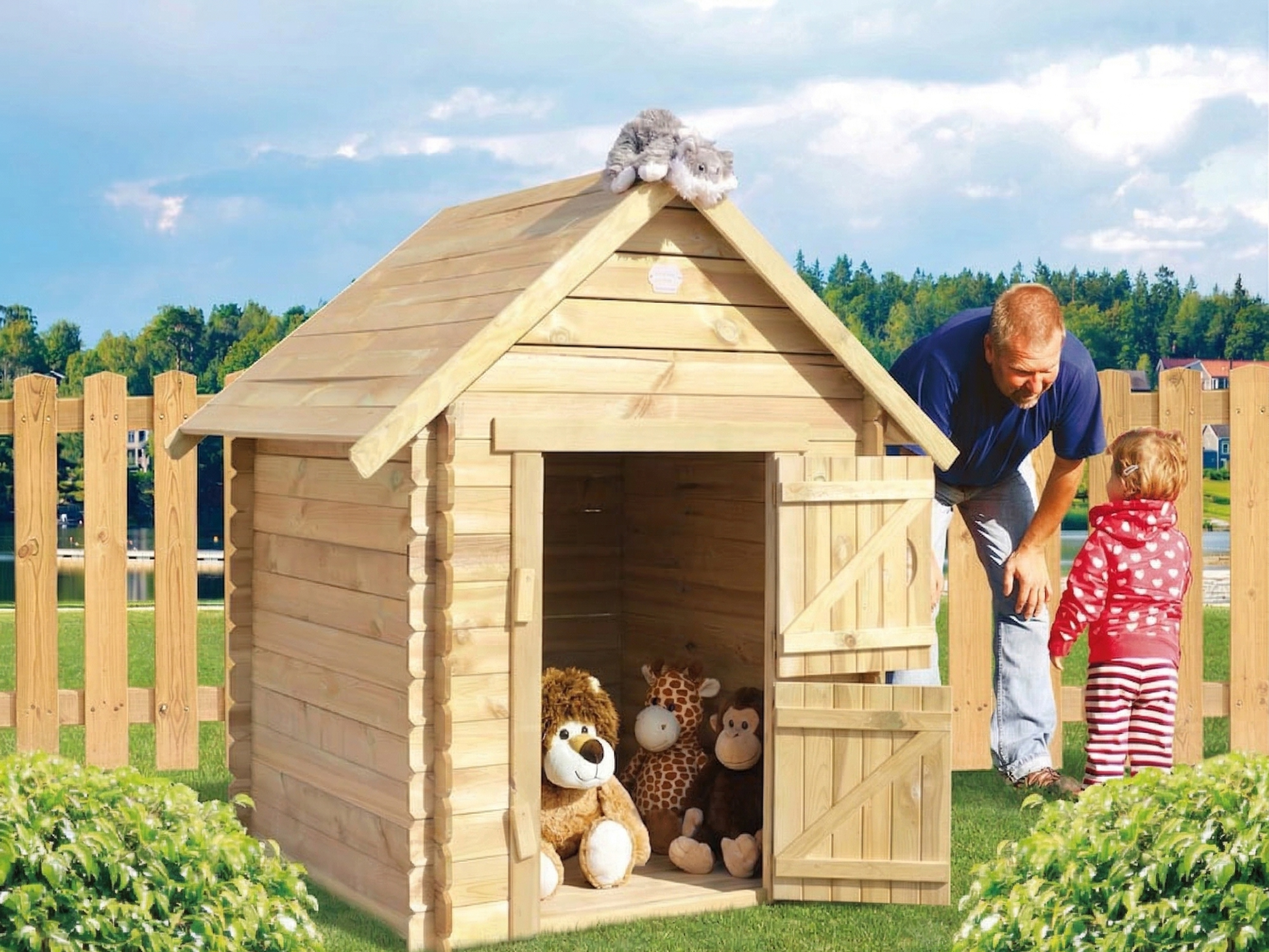 Spielhäuser müssen auf einem festen Untergrund, z.B. Beton oder Fliesen, stehen und dürfen nicht mit Erde, Wiese etc. in Berührung kommen (Gefahr von Fäulnisschädigung).