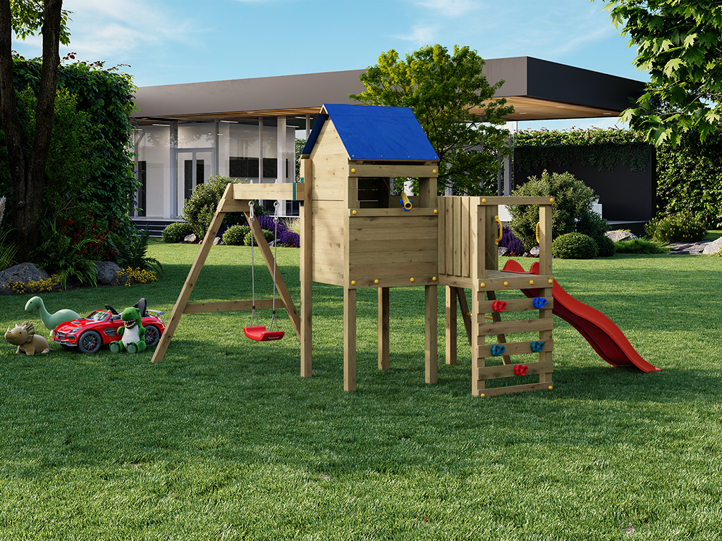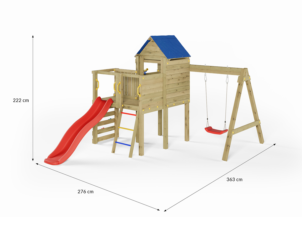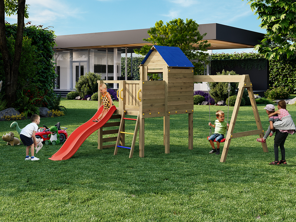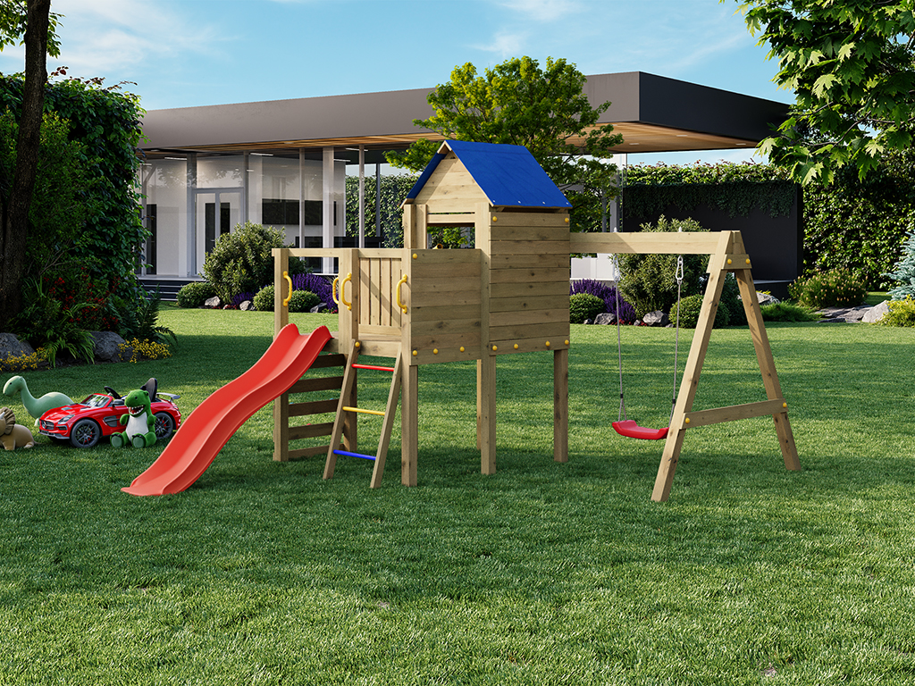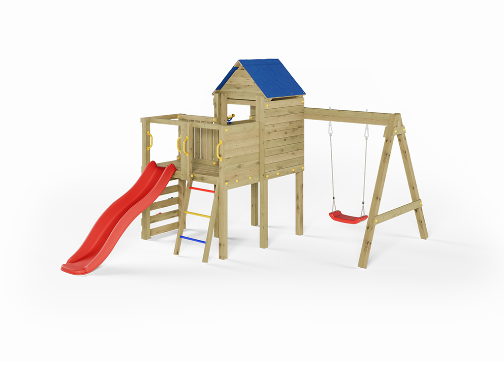 Mit diesem Spielturm verwandelt sich Dein Garten schon für die Kleinsten in ein Spieleparadies. Der Spielturm ist mit einem 90 cm hohen Podest ausgestattet und damit der perfekte Einstieg für kleine Kinder. Auf der 143 x 143 cm großen Plattform befindet sich ein offen gestaltetes Spielhaus mit blauem Planendach. Mit dem mitgelieferten Spiel-Fernrohr haben die Kinder alles im Blick. Die Plattform kann einserseits über die Kletterwand mit 5 bunten Klettersteinen oder die stabile Leiter mit abgerundeten Metallsprossen erreicht werden. Für weiteren Spielspaß sorgt eine Wellenrutsche in der Farbe Deiner Wahl und die Einzelschaukel mit rotem Schaukelsitz. - Stabile Grundkonstruktion