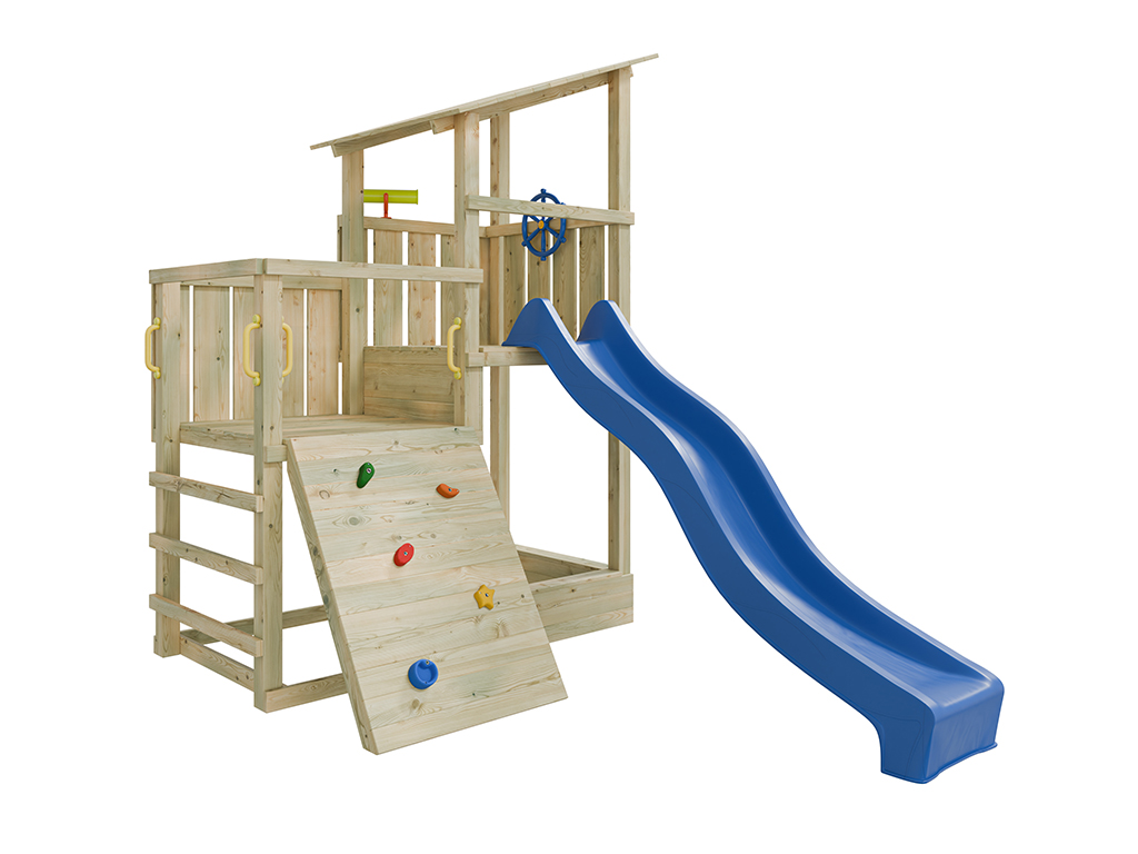 Der Spielturm wird mit Rutsche, Steuerrad und Fernrohr geliefert und sorgt für großes Spielvergnügen bei den Kindern.