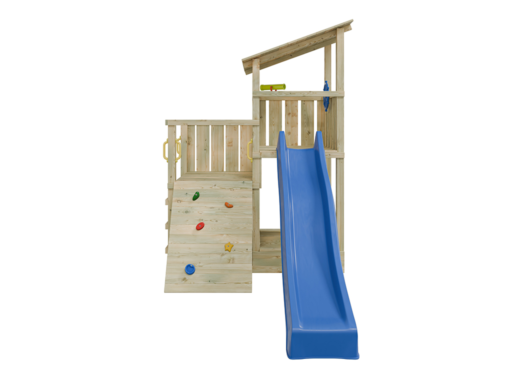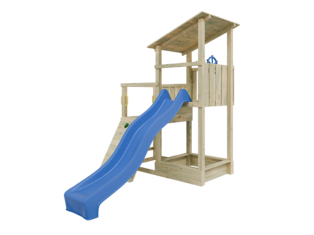 Der Spielturm ist aus kesseldruckimprägniertem Kiefernholz gefertigt und ist somit besonders witterungsbeständig. Die 7 x 7 cm starken Pfosten gewährleisten höchste Stabilität. Stabile Brüstungsgeländer schützen die Kleinen und laden zum Versteckspiel ein. Nach vollständiger Trocknung kann das Spielhaus nach Lust und Laune mit einem Farbanstrich gestrichen werden. Wir empfehlen hierzu eine offenporige, hoch pigmentierte Holzschutzfarbe. Beachte hierzu unser großes Zubehörsortiment. - Inkl. Rutsche