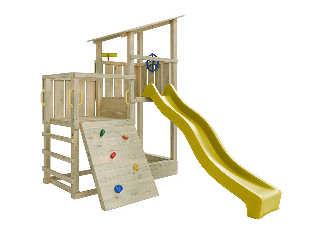 Mit diesem Spielturm in Schiffsform verwandelt sich dein Garten schon für die Kleinsten in ein Piratenparadies. Der Spielturm ist mit einem 90 cm hohen und einem 120 cm hohen Podest ausgestattet. Unter dem teilüberdachten Podest befindet sich ein kleiner Sandkasten mit Sitzbrettern. Der Aufstieg auf das 90 cm Podest kann entweder über die stabile Trittleiter oder die Kletterwand mit 5 bunten Klettersteinen erreicht werden. - Stabile Grundkonstruktion