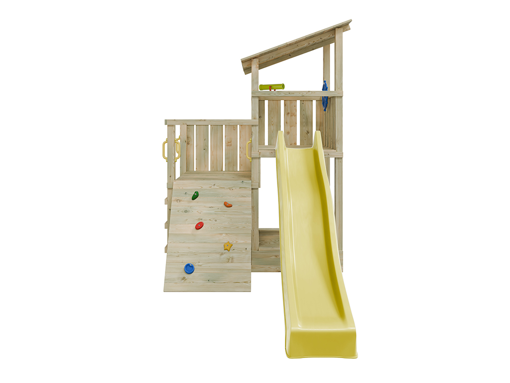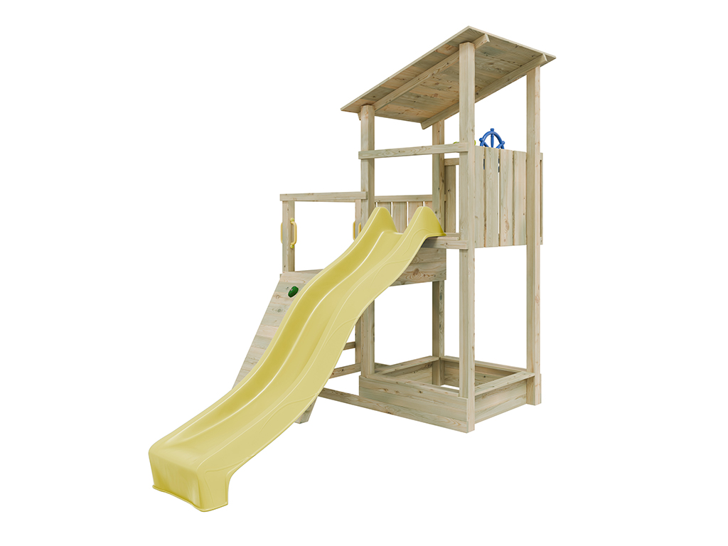 Der Spielturm ist aus kesseldruckimprägniertem Kiefernholz gefertigt und ist somit besonders witterungsbeständig. Die 7 x 7 cm starken Pfosten gewährleisten höchste Stabilität. Stabile Brüstungsgeländer schützen die Kleinen und laden zum Versteckspiel ein. Nach vollständiger Trocknung kann das Spielhaus nach Lust und Laune mit einem Farbanstrich gestrichen werden. Wir empfehlen hierzu eine offenporige, hoch pigmentierte Holzschutzfarbe. Beachte hierzu unser großes Zubehörsortiment. - Inkl. Rutsche