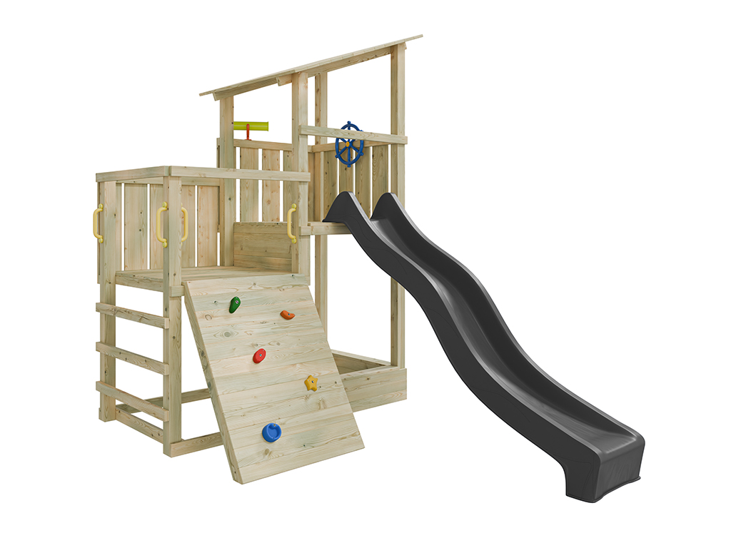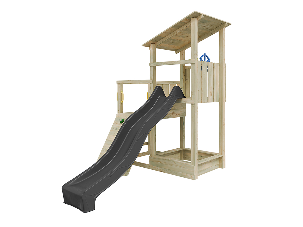 Der Spielturm wird mit Rutsche, Steuerrad und Fernrohr geliefert und sorgt für großes Spielvergnügen bei den Kindern.