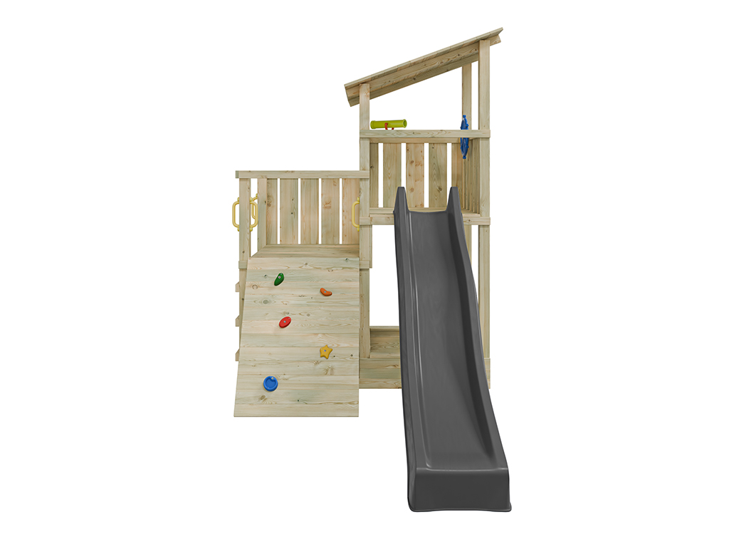 Der Spielturm ist aus kesseldruckimprägniertem Kiefernholz gefertigt und ist somit besonders witterungsbeständig. Die 7 x 7 cm starken Pfosten gewährleisten höchste Stabilität. Stabile Brüstungsgeländer schützen die Kleinen und laden zum Versteckspiel ein. Nach vollständiger Trocknung kann das Spielhaus nach Lust und Laune mit einem Farbanstrich gestrichen werden. Wir empfehlen hierzu eine offenporige, hoch pigmentierte Holzschutzfarbe. Beachte hierzu unser großes Zubehörsortiment. - Inkl. Rutsche