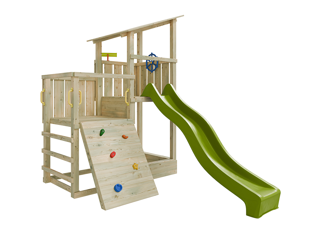 Der Spielturm wird mit Rutsche, Steuerrad und Fernrohr geliefert und sorgt für großes Spielvergnügen bei den Kindern.