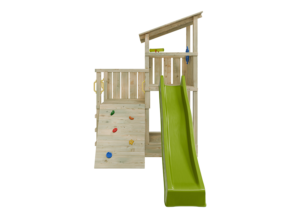 Der Spielturm ist aus kesseldruckimprägniertem Kiefernholz gefertigt und ist somit besonders witterungsbeständig. Die 7 x 7 cm starken Pfosten gewährleisten höchste Stabilität. Stabile Brüstungsgeländer schützen die Kleinen und laden zum Versteckspiel ein. Nach vollständiger Trocknung kann das Spielhaus nach Lust und Laune mit einem Farbanstrich gestrichen werden. Wir empfehlen hierzu eine offenporige, hoch pigmentierte Holzschutzfarbe. Beachte hierzu unser großes Zubehörsortiment. - Inkl. Rutsche