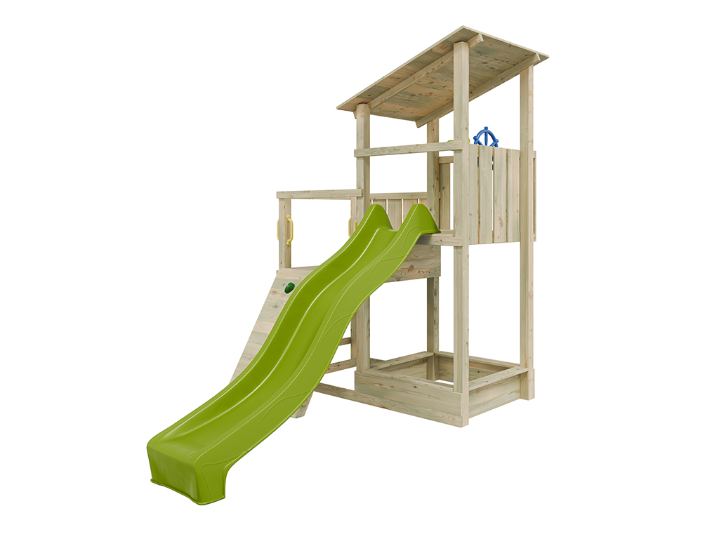 Der Spielturm wird mit Rutsche, Steuerrad und Fernrohr geliefert und sorgt für großes Spielvergnügen bei den Kindern.
