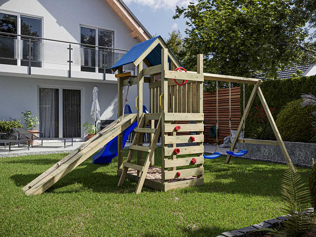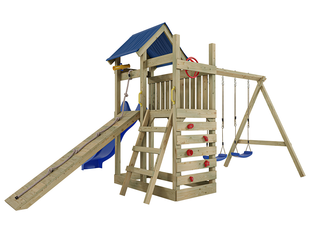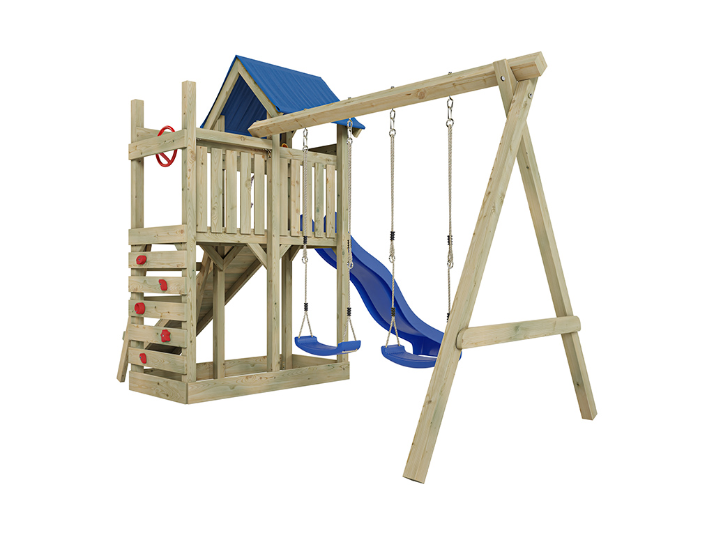 - Inklusive Rutsche in Blau mit 9 x 9 cm starkem Schaukelbalken.