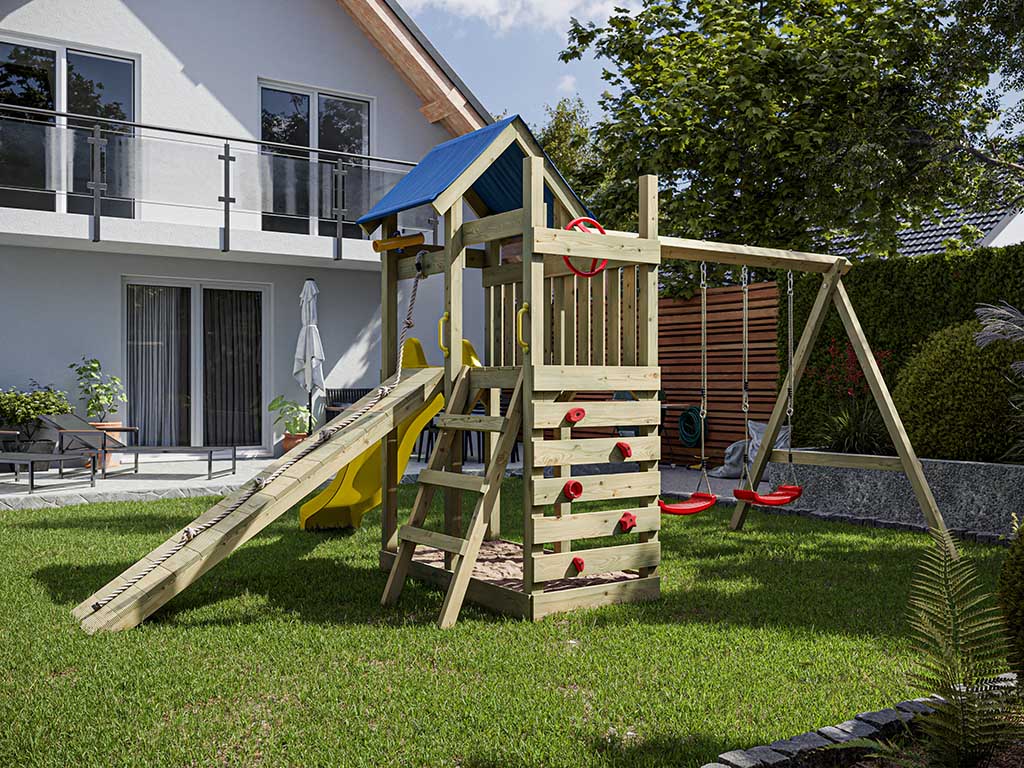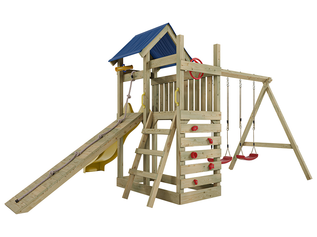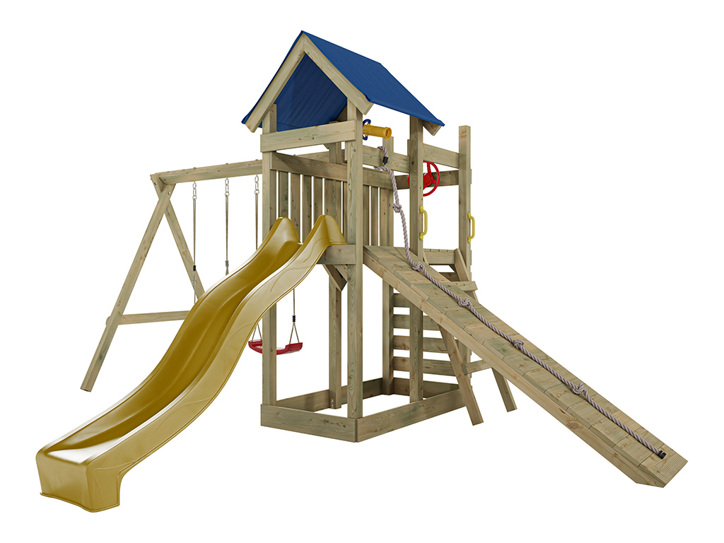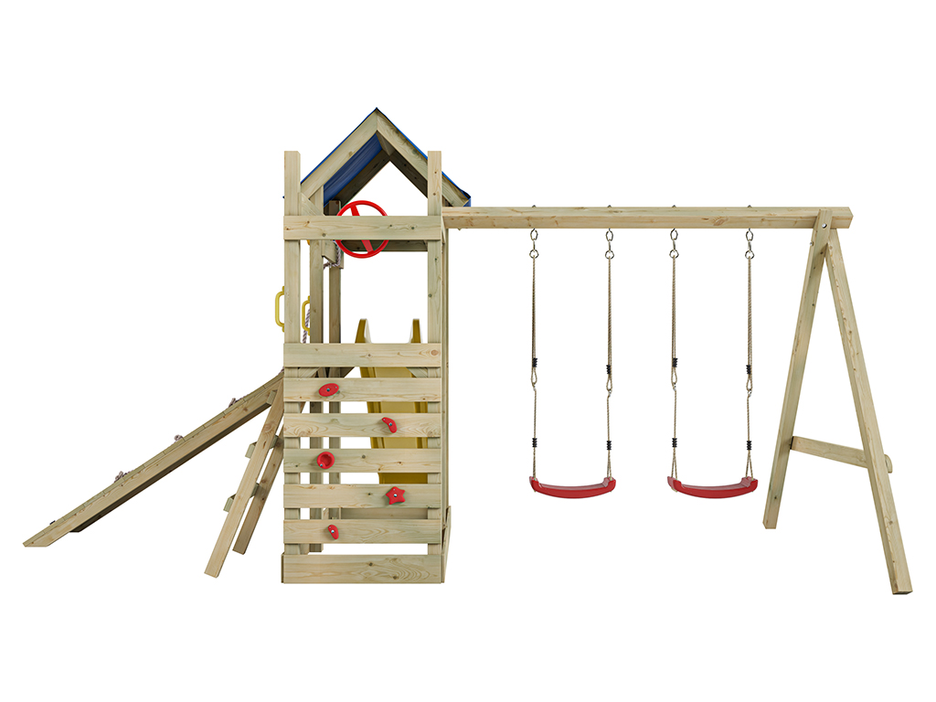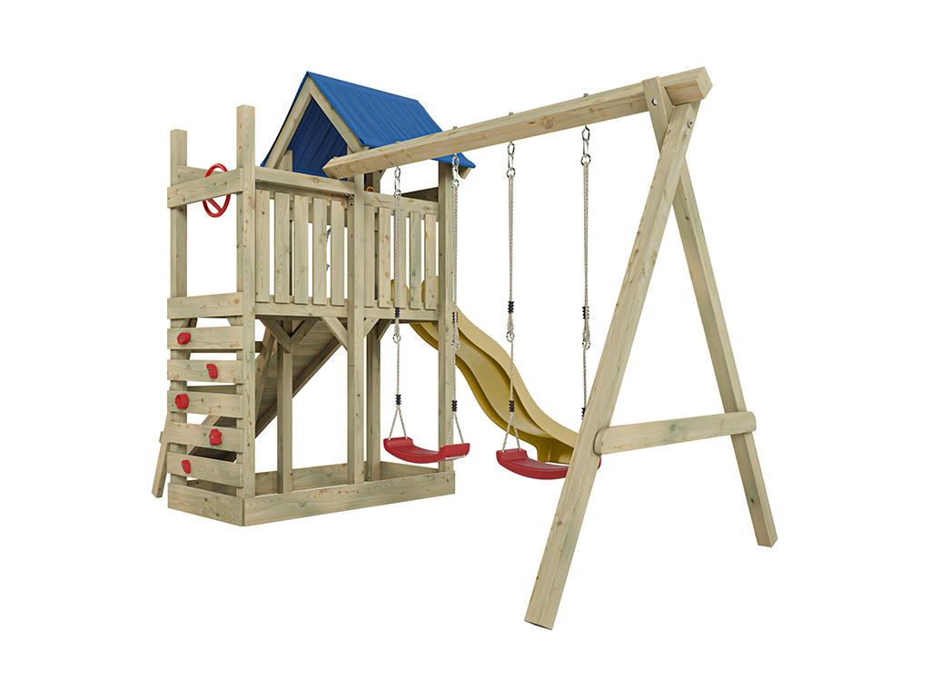 - Inklusive Rutsche in Gelb mit 9 x 9 cm starkem Schaukelbalken.