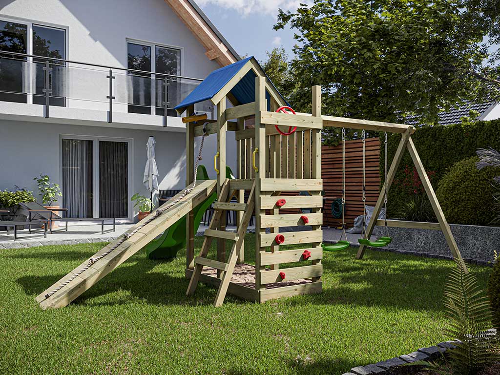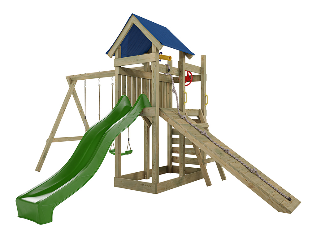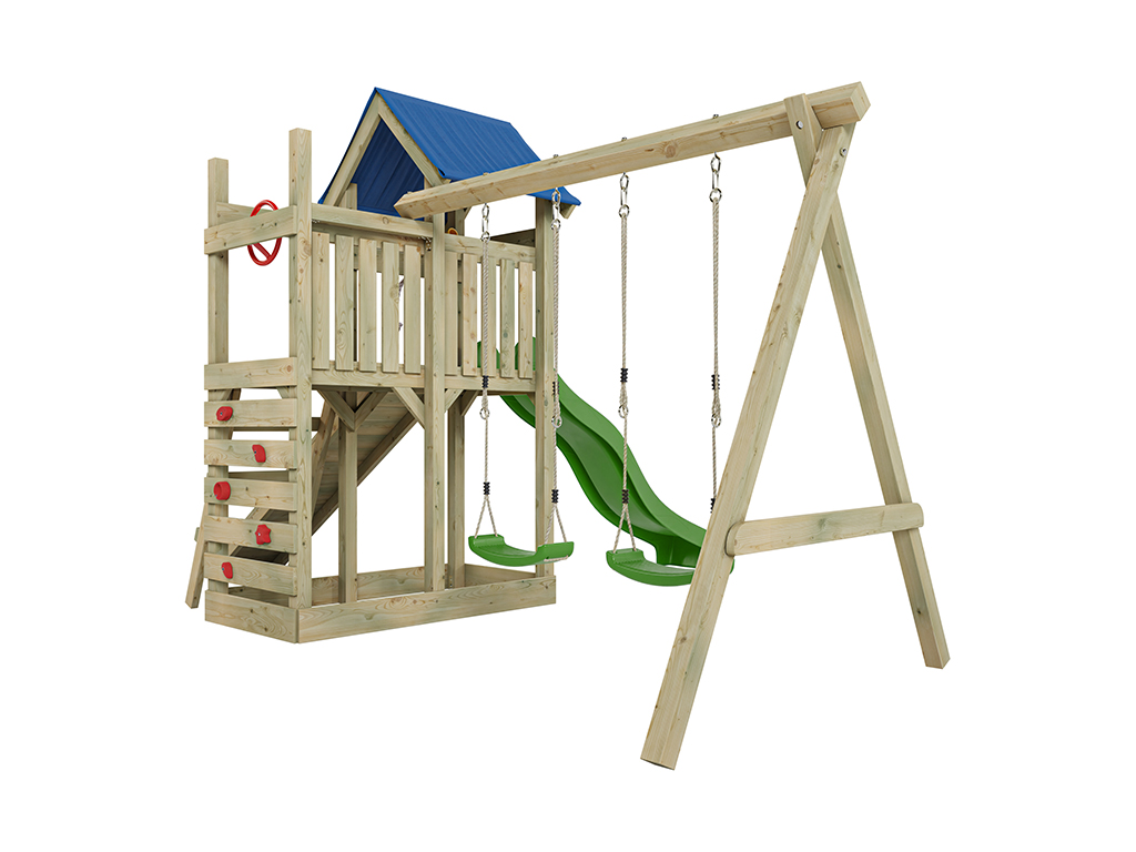 - Inklusive Rutsche in Grün mit 9 x 9 cm starkem Schaukelbalken.