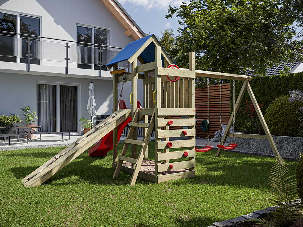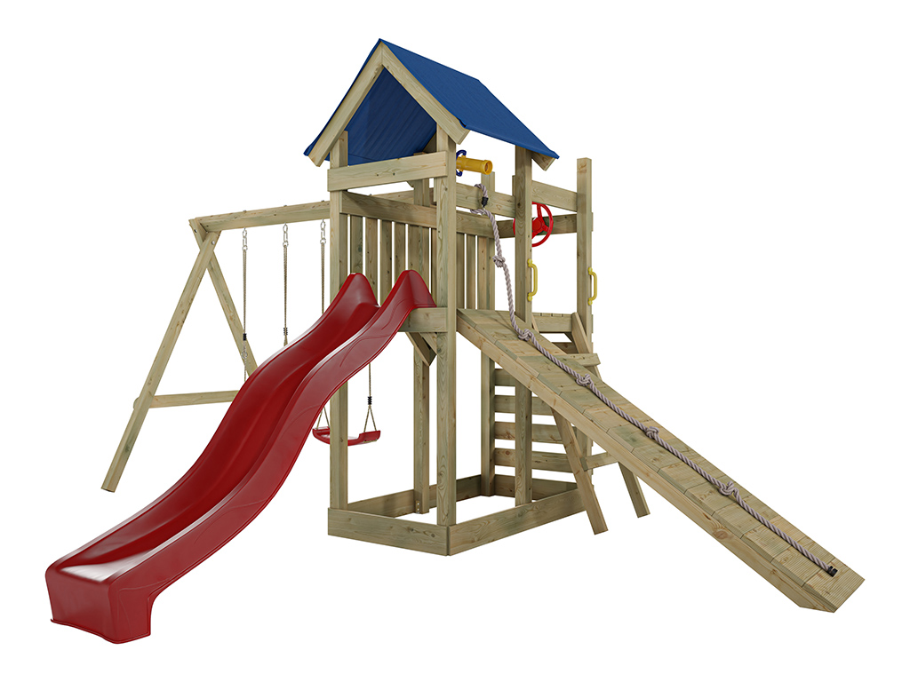 - Inklusive Rutsche in Rot mit 9 x 9 cm starkem Schaukelbalken.