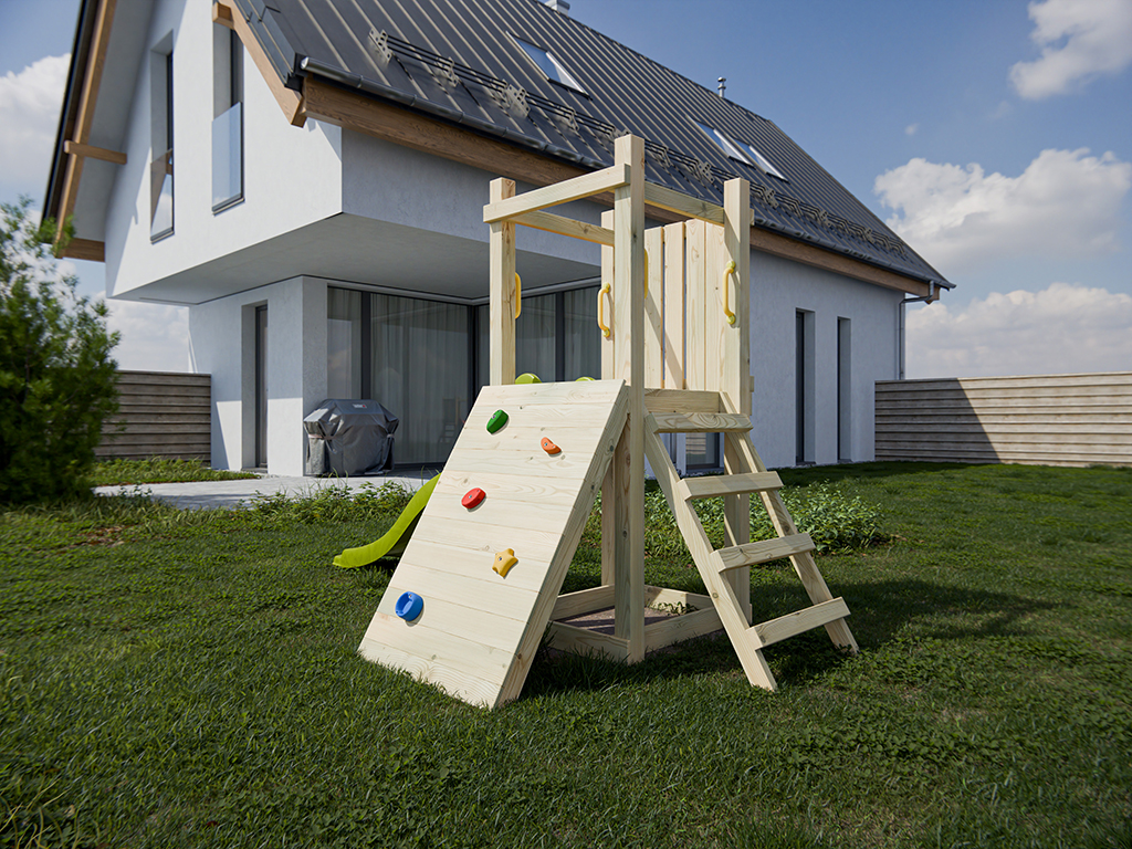 Dieser Spielturm ist mit dem 90 cm hohen Podest ein perfekter Einstieg für kleinere Kinder in die Welt des aktiven Spielens im Garten