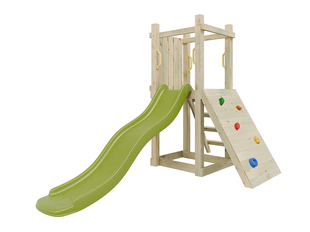 Der Spielturm ist mit einer Rutsche ausgestattet, die an das 90 cm hohe Podest montiert wird. Auf das Podest gelangen die Kinder entweder über die Leiter mit vier Trittstufen oder über die Kletterwand mit 5 bunten Klettersteinen. - Inkl. vier Haltegriffe