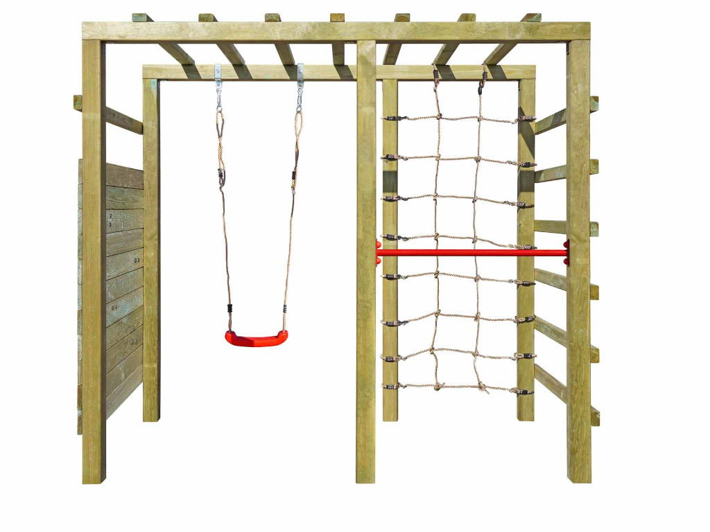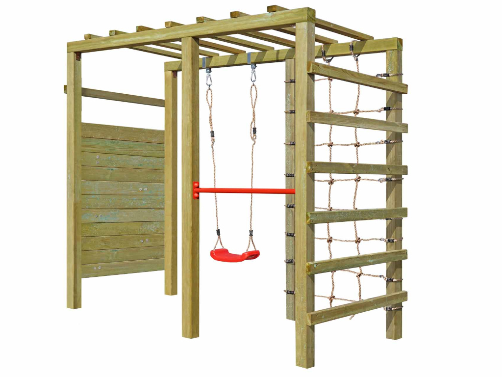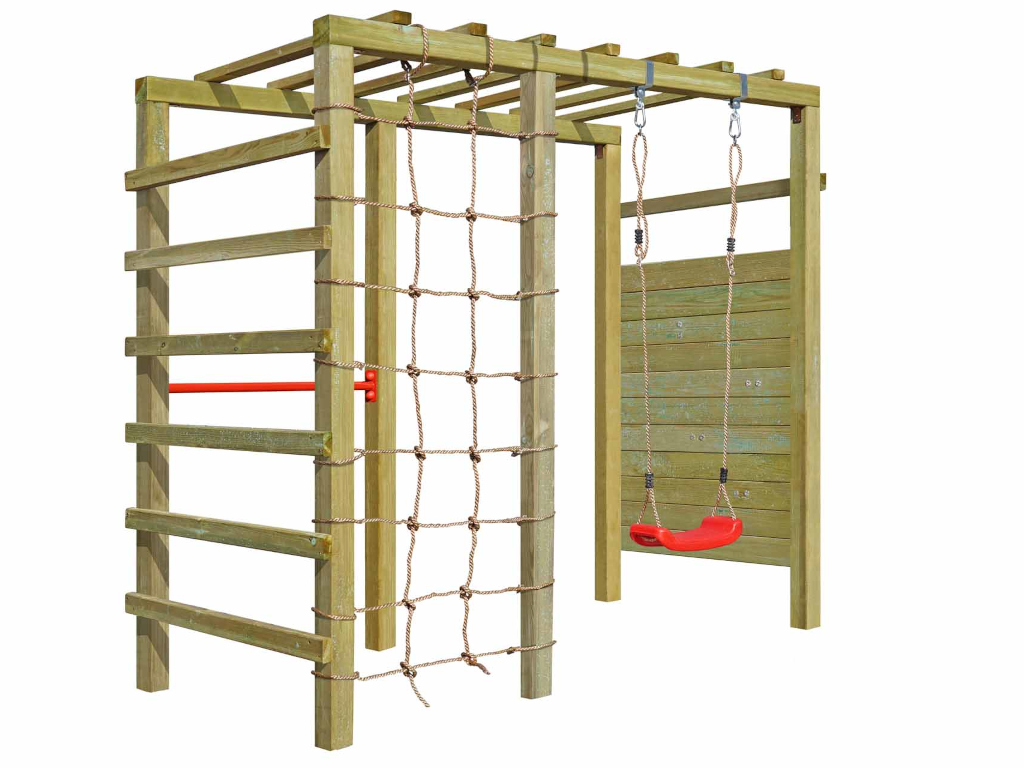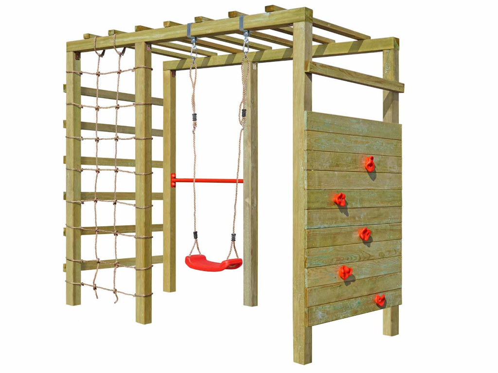 Material: Holz, B x T x H: 240 x 120 x 219 cm, inkl. Kletterwand + Kletternetz, inkl. Schaukelsitz + Reckstange