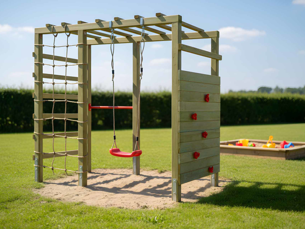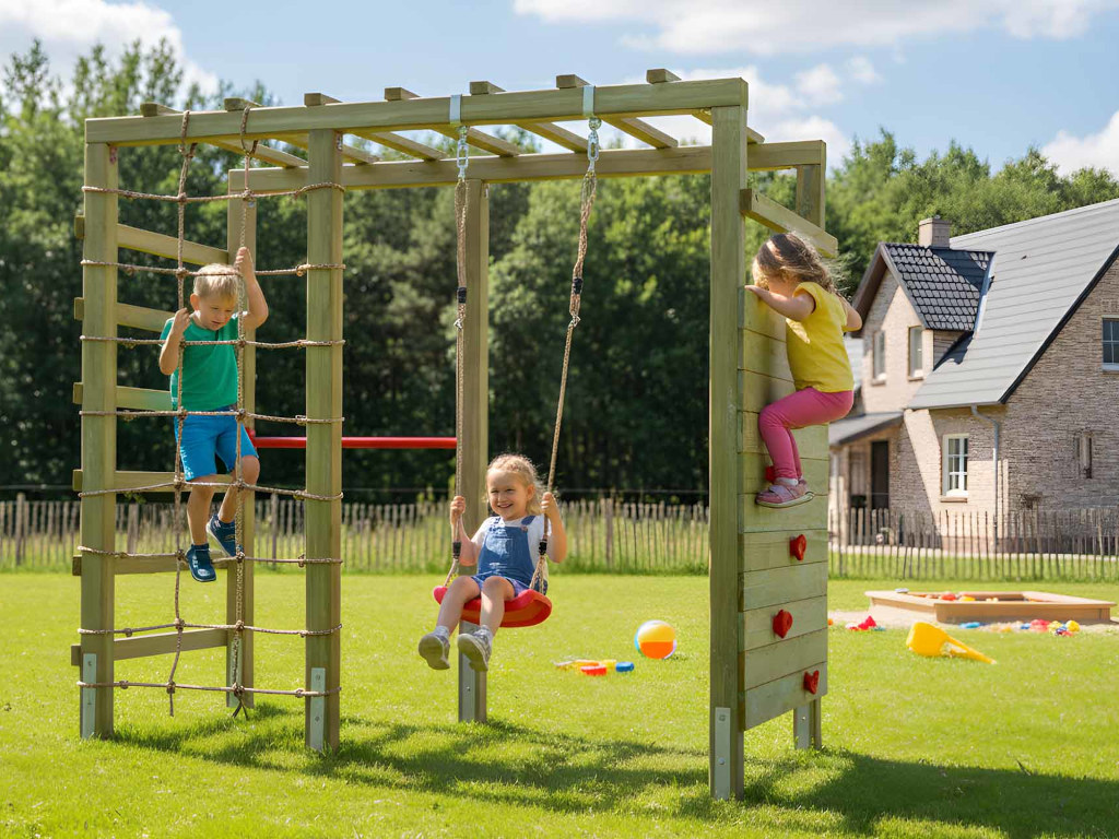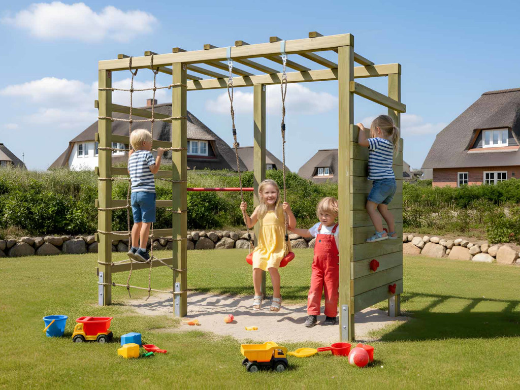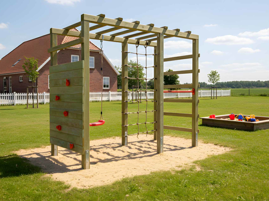 Material: Holz, B x T x H: 240 x 120 x 219 cm, inkl. Kletterwand + Kletternetz, inkl. Schaukelsitz + Reckstange