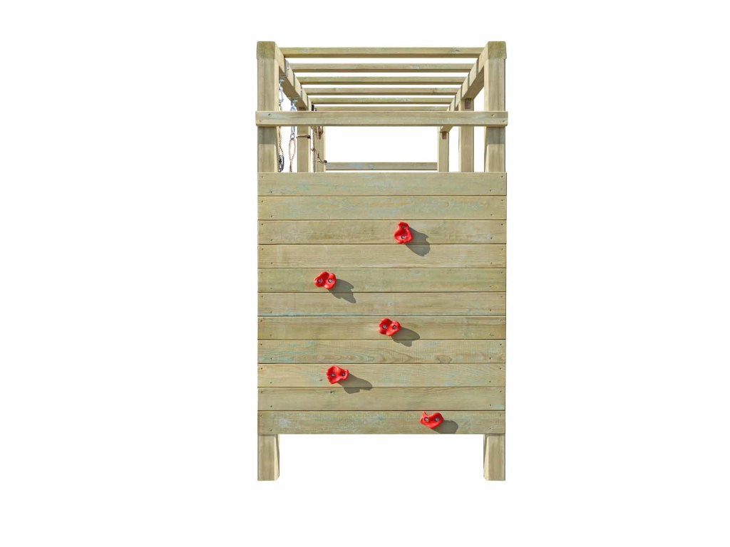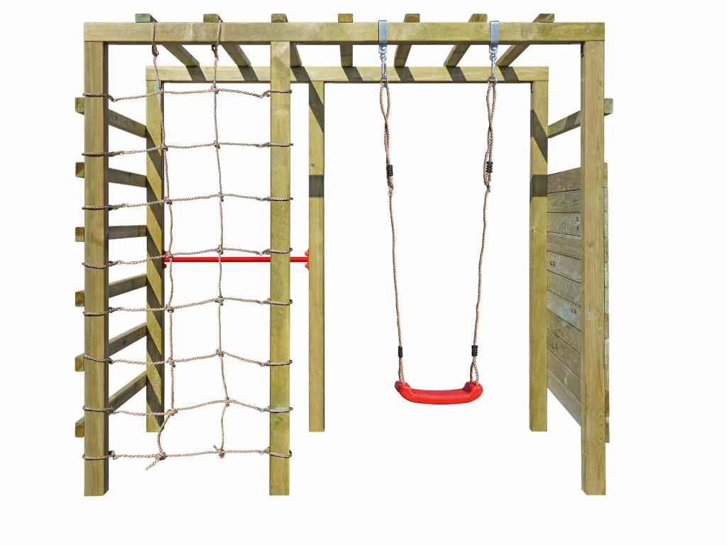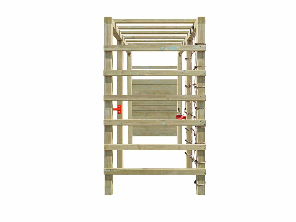 - Klettergerüst Hango Rex, Kletterwand, 5x Klettersteine rot, kleines Kletternetz, 1x Schaukelsitz rot, Reckstange rot