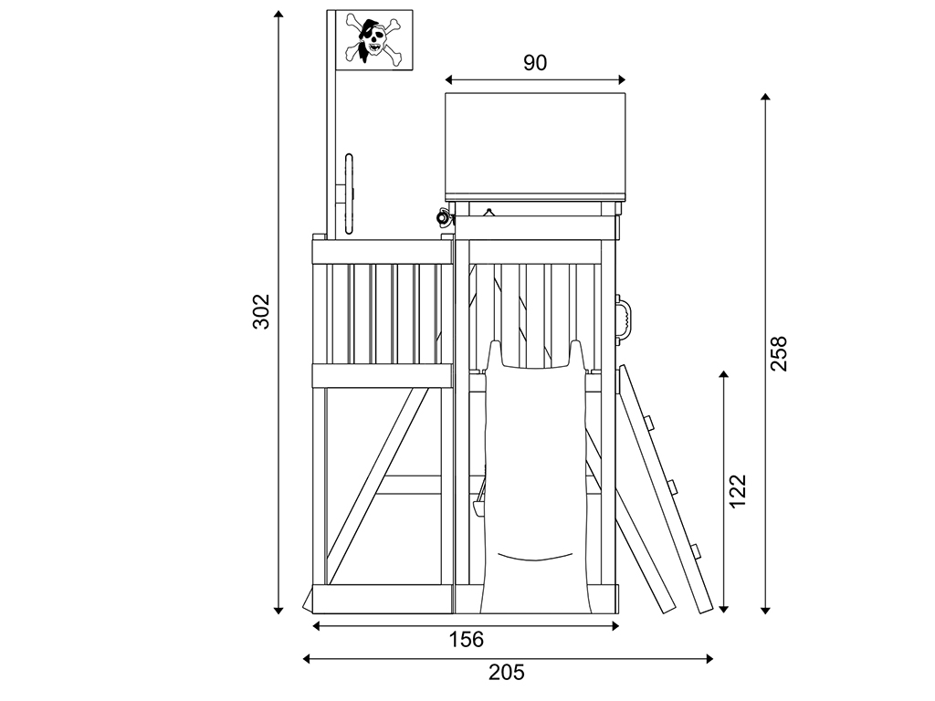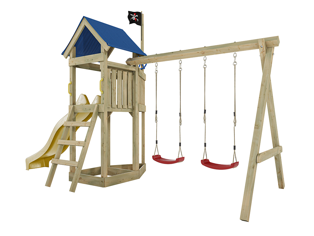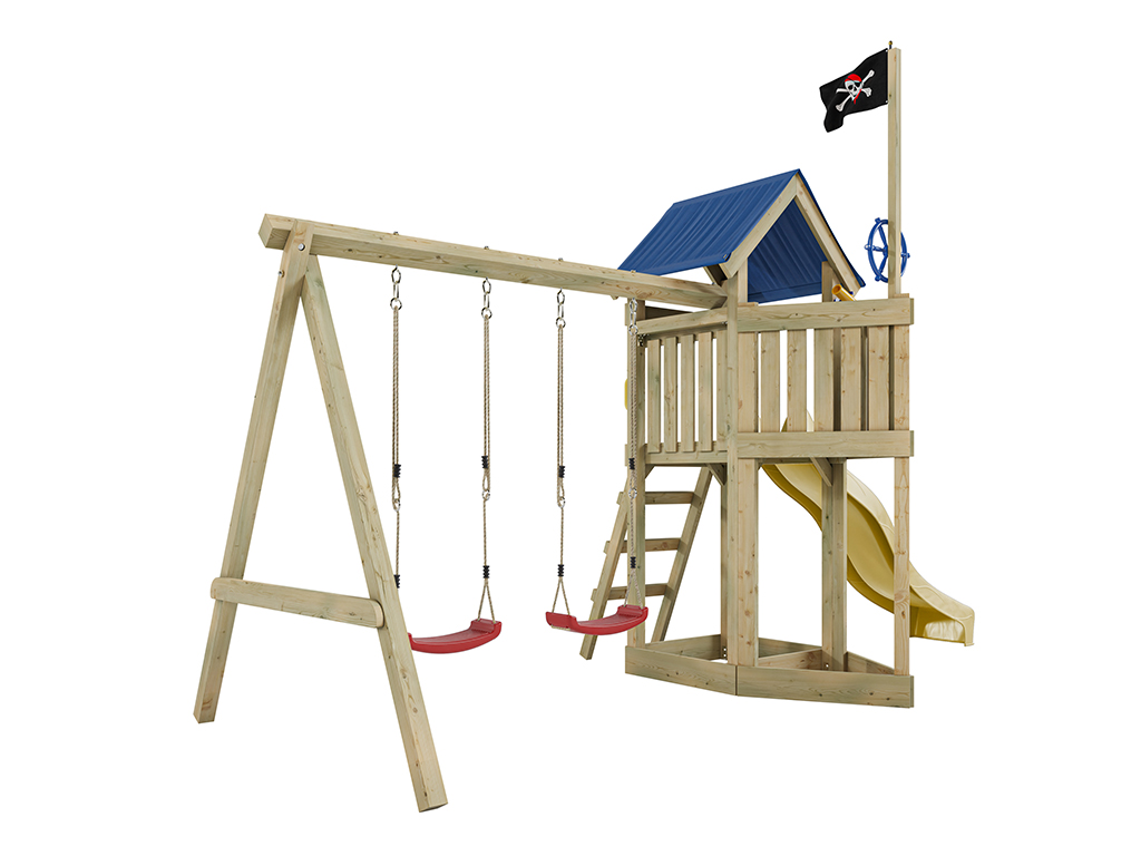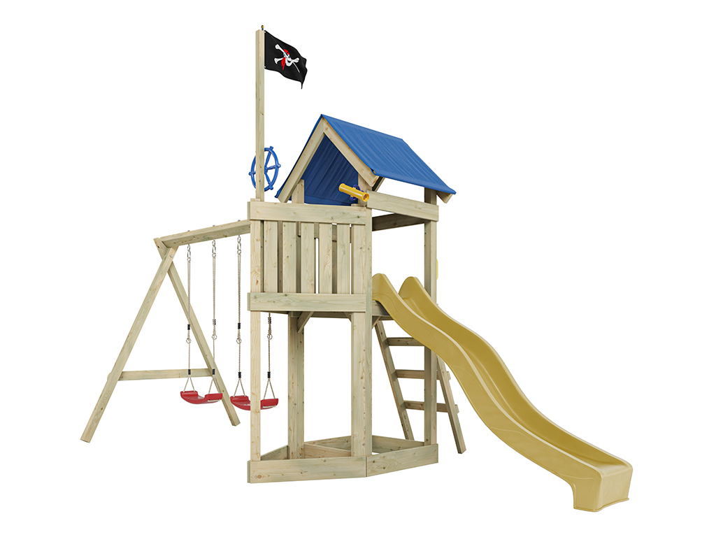 Für kleine Entdecker und große Piraten bietet dir der Spielturm eine Captain Jolly Flagge. Dieser Name ist das berühmte Symbol für alle Piraten. Aus der Ferne erkennbar und der Traum eines jeden Piraten unter einem zu segeln. Das große Schiff mit seinen 507 x 205 x 258 cm, bietet ein Dach, um vor der rauen See zu schützen und unbekannte Inseln auch bei Stürmen zu finden. Die Aussichtsplattform wurde dafür auf 122 cm Höhe angesetzt. Um sich schnell ins Abenteuer zu stürzen findet sich eine blaue Rutsche am Backbord (links). Doch um wieder schnell in See zu stechen ist eine Kletterwand am Heck des Schiffes oder eine Leiter an der Steuerbord Seite. Sollten andere Piraten auf hoher See auftauchen, ist das Schiff mit einer Doppelschaukel ausgerüstet, um schnell auf das andere Schiff zu belangen.