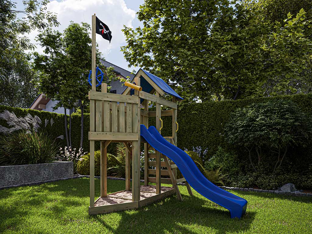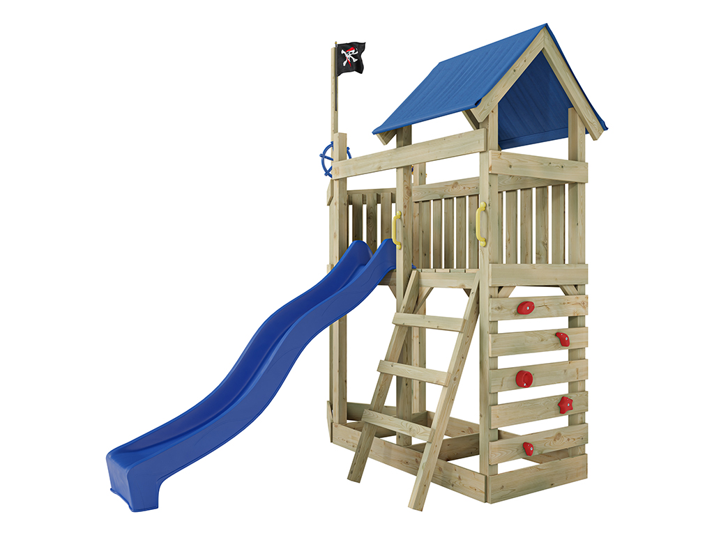 Für kleine Entdecker und große Piraten bietet dir der Spielturm eine Captain-Snappy-Flagge. Dieser Name ist das berühmte Symbol für alle Piraten. Aus der Ferne erkennbar und der Traum eines jeden Piraten, unter einem zu segeln. Das große Schiff mit seinen 275 x 229 x 258 cm, bietet ein Dach, um vor der rauen See zu schützen und unbekannte Inseln auch bei Stürmen zu finden. Die Aussichtsplattform wurde dafür auf 122 cm Höhe angesetzt. Um sich schnell ins Abenteuer zu stürzen, findet sich eine blaue Rutsche am Backbord (links). Doch um wieder schnell in See zu stechen, ist eine Kletterwand am Heck des Schiffes oder eine Leiter an der Steuerbordseite.