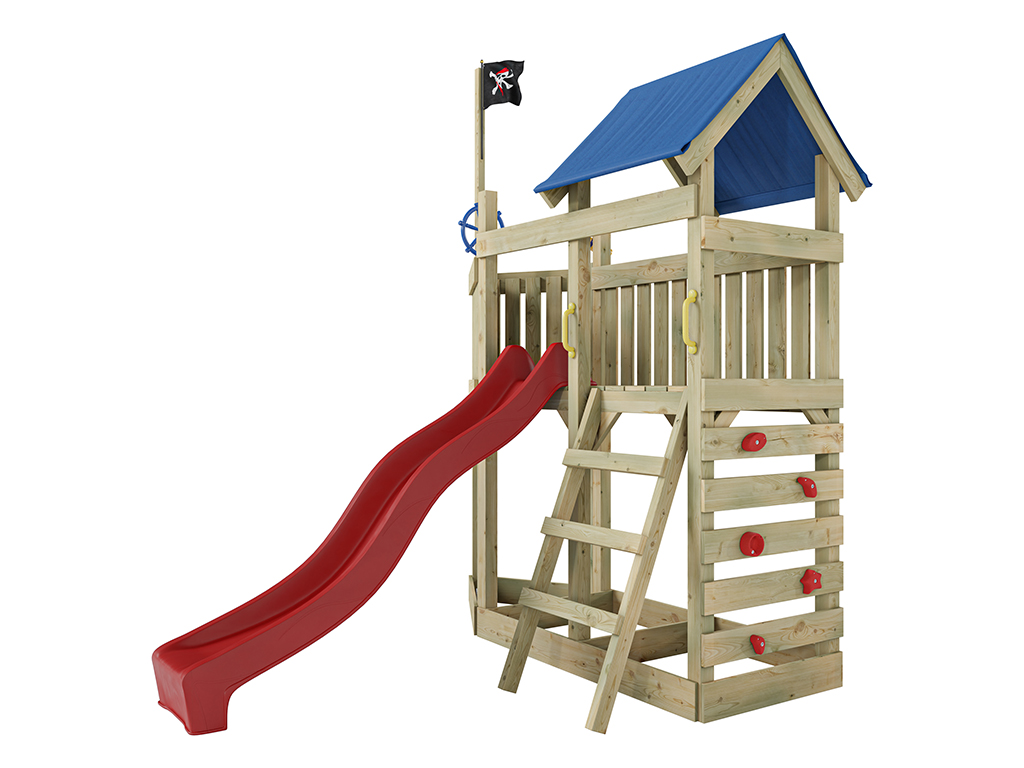 Für kleine Entdecker und große Piraten bietet dir der Spielturm eine Captain Jolly Flagge. Dieser Name ist das berühmte Symbol für alle Piraten. Aus der Ferne erkennbar und der Traum eines jeden Piraten unter einem zu segeln. Das große Schiff mit seinen 275 x 229 x 258 cm, bietet ein Dach, um vor der rauen See zu schützen und unbekannte Inseln auch bei Stürmen zu finden. Die Aussichtsplattform wurde dafür auf 122 cm Höhe angesetzt. Um sich schnell ins Abenteuer zu stürzen findet sich eine blaue Rutsche am Backbord (links). Doch um wieder schnell in See zu stechen ist eine Kletterwand am Heck des Schiffes oder eine Leiter an der Steuerbord Seite.