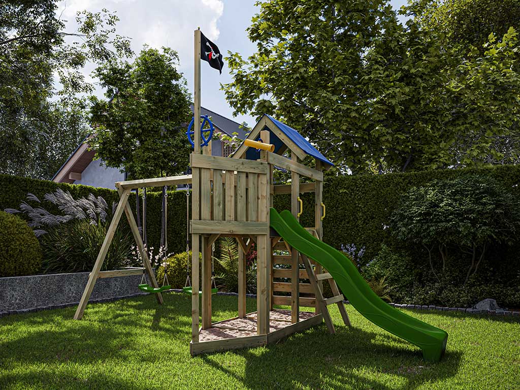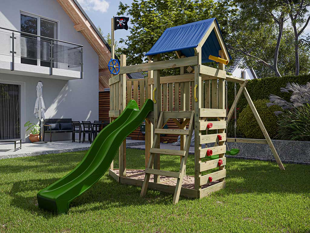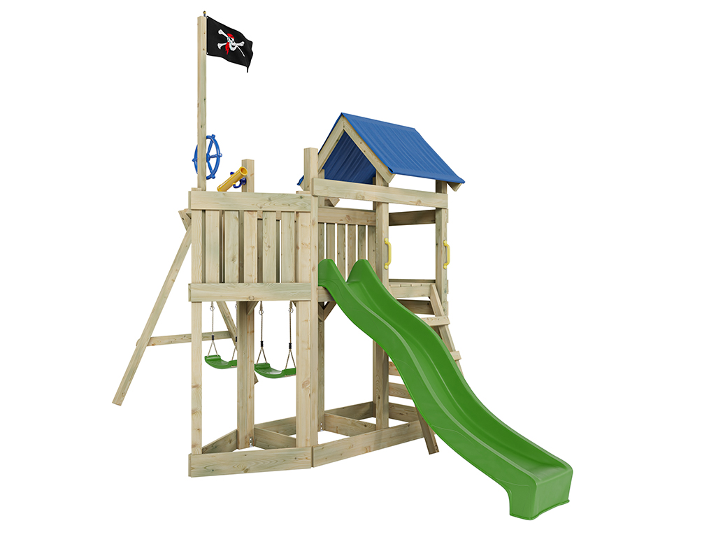 Für kleine Entdecker und große Piraten bietet dir der Spielturm eine Captain-Jolly-Flagge. Dieser Name ist das berühmte Symbol für alle Piraten. Aus der Ferne erkennbar und der Traum eines jeden Piraten, unter einem zu segeln. Das große Schiff mit seinen 507 x 255 x 258 cm bietet ein Dach, um vor der rauen See zu schützen und unbekannte Inseln auch bei Stürmen zu finden. Die Aussichtsplattform wurde dafür auf 122 cm Höhe angesetzt. Um sich schnell ins Abenteuer zu stürzen, findet sich eine blaue Rutsche an Backbord (links). Doch um wieder schnell in See zu stechen, ist eine Kletterwand am Heck des Schiffes oder eine Leiter an der Steuerbord Seite. Sollten andere Piraten auf hoher See auftauchen, ist das Schiff mit einer Doppelschaukel ausgerüstet, um schnell auf das andere Schiff zu gelangen.