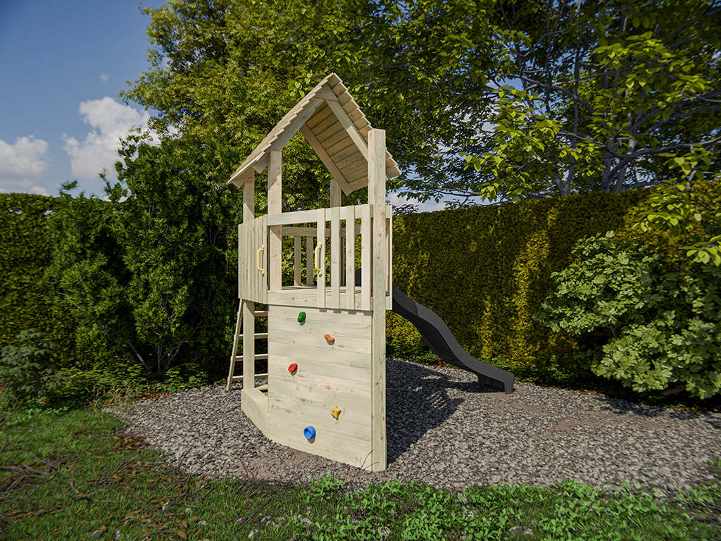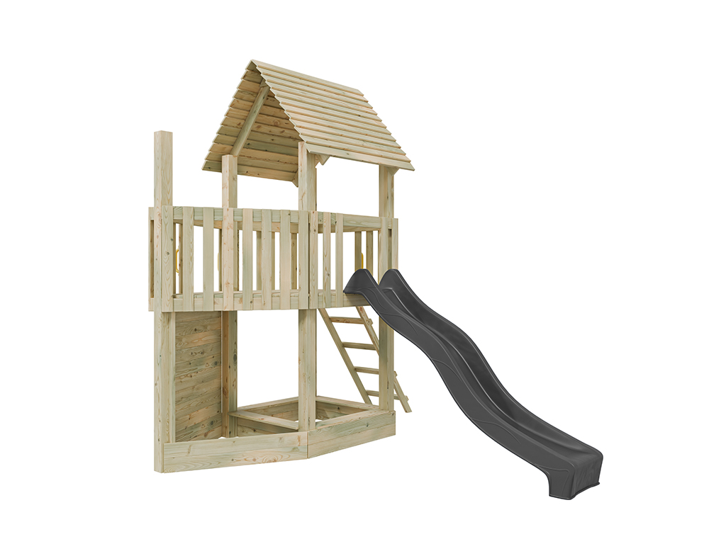 Der Spielturm ist aus kesseldruckimprägniertem Kiefernholz gefertigt und ist somit besonders witterungsbeständig. Die 7 x 7 cm starken Pfosten gewährleisten höchste Stabilität. Stabile Brüstungsgeländer schützen die Kleinen und laden zum Versteckspiel ein. Das stabile Satteldach mit überlappenden Holzbrettern schützt für Sonne und Regen. Nach vollständiger Trocknung kann das Spielhaus nach Lust und Laune mit einem Farbanstrich gestrichen werden. Wir empfehlen hierzu eine offenporige, hoch pigmentierte Holzschutzfarbe. Beachte hierzu unser großes Zubehörsortiment. - Inkl. Rutsche