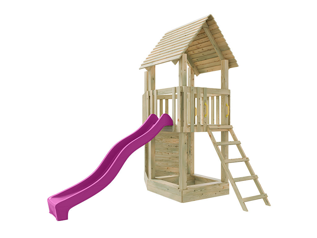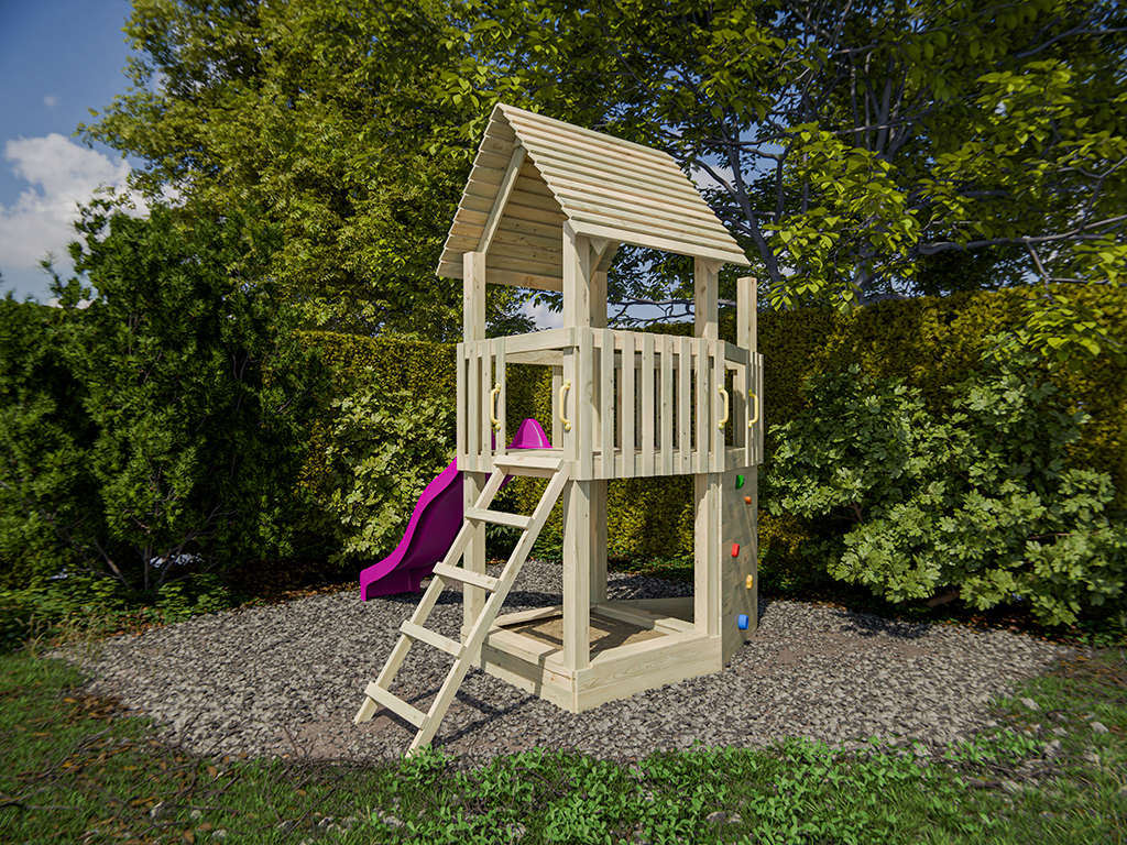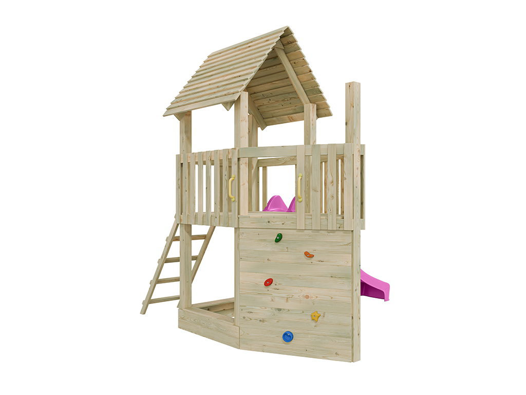 Der Spielturm wird mit Kletterwand, Sandkasten und Rutsche geliefert und sorgt für großes Spielvergnügen bei den Kindern.