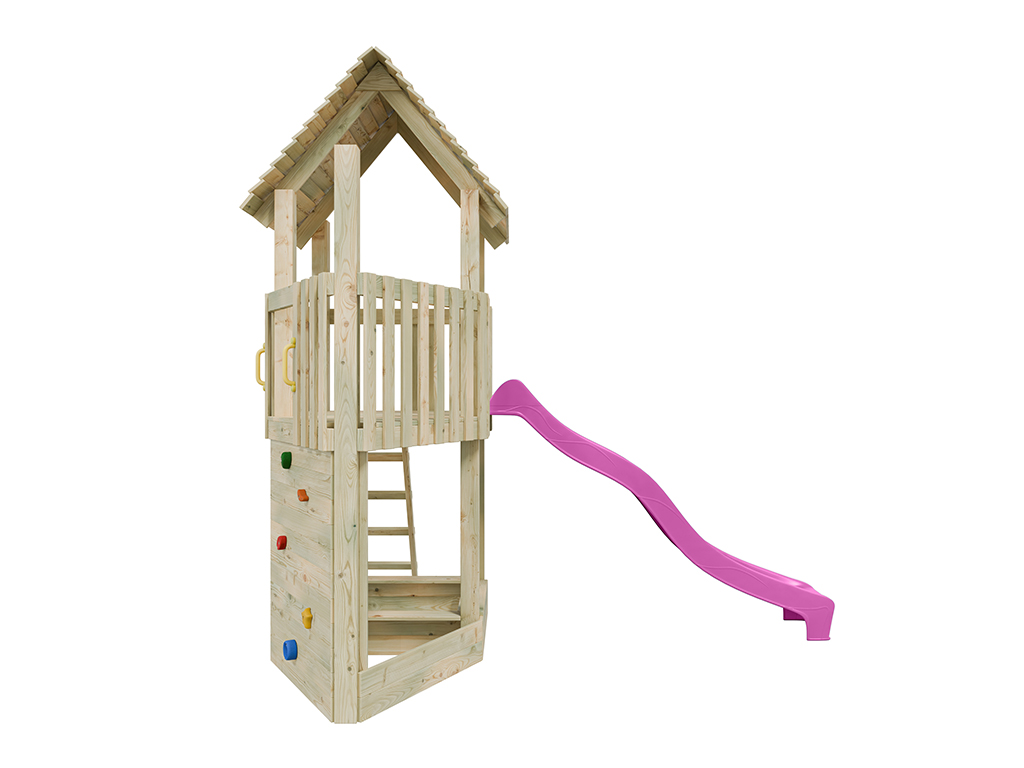 Der Spielturm ist aus kesseldruckimprägniertem Kiefernholz gefertigt und ist somit besonders witterungsbeständig. Die 7 x 7 cm starken Pfosten gewährleisten höchste Stabilität. Stabile Brüstungsgeländer schützen die Kleinen und laden zum Versteckspiel ein. Das stabile Satteldach mit überlappenden Holzbrettern schützt für Sonne und Regen. Nach vollständiger Trocknung kann das Spielhaus nach Lust und Laune mit einem Farbanstrich gestrichen werden. Wir empfehlen hierzu eine offenporige, hoch pigmentierte Holzschutzfarbe. Beachte hierzu unser großes Zubehörsortiment. - Inkl. Rutsche