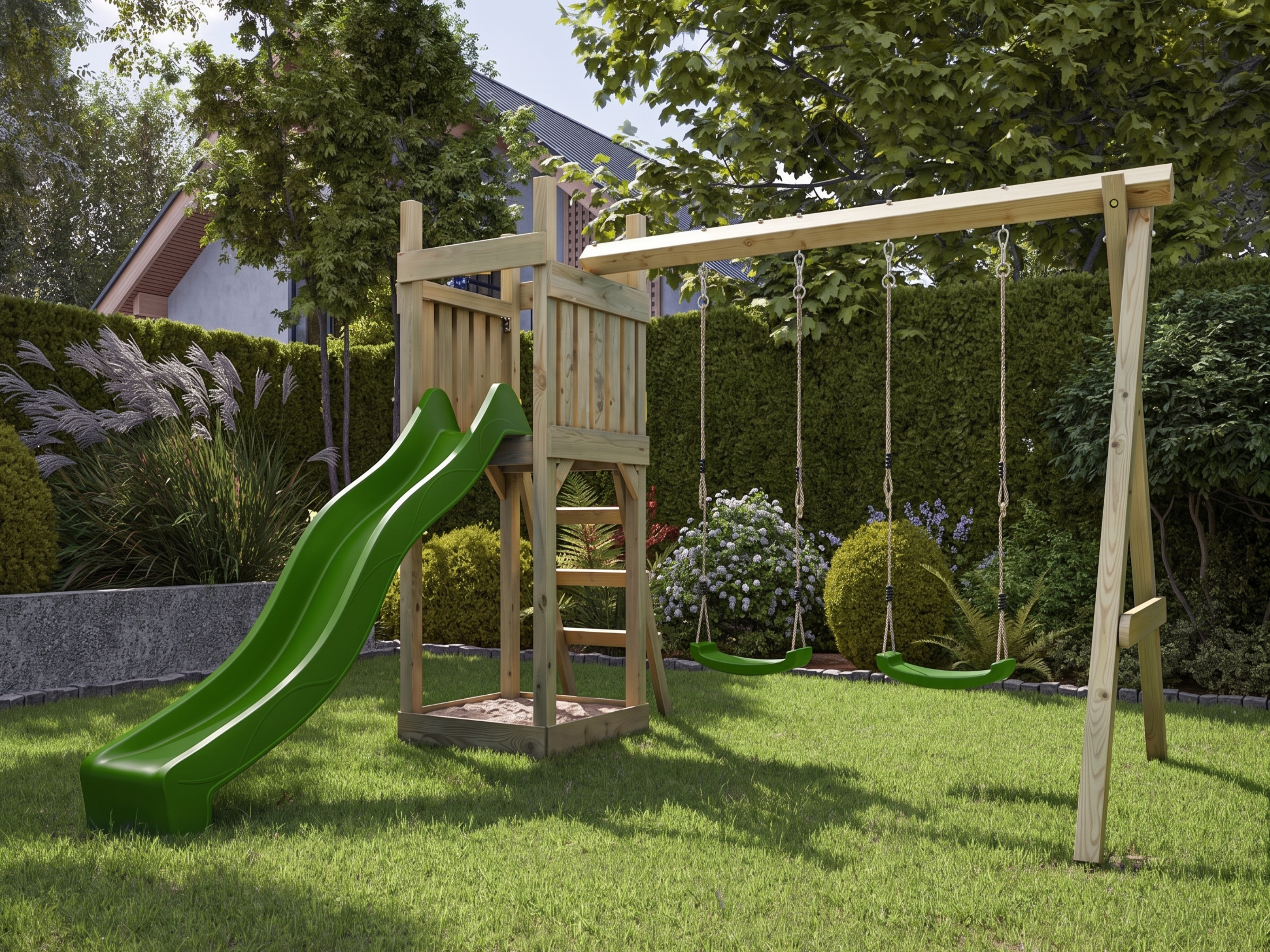 Spielturm Skinny KDI inkl. Doppelschaukel inkl. Rutsche grün + Sitze grün