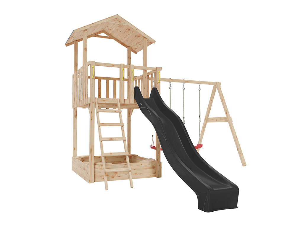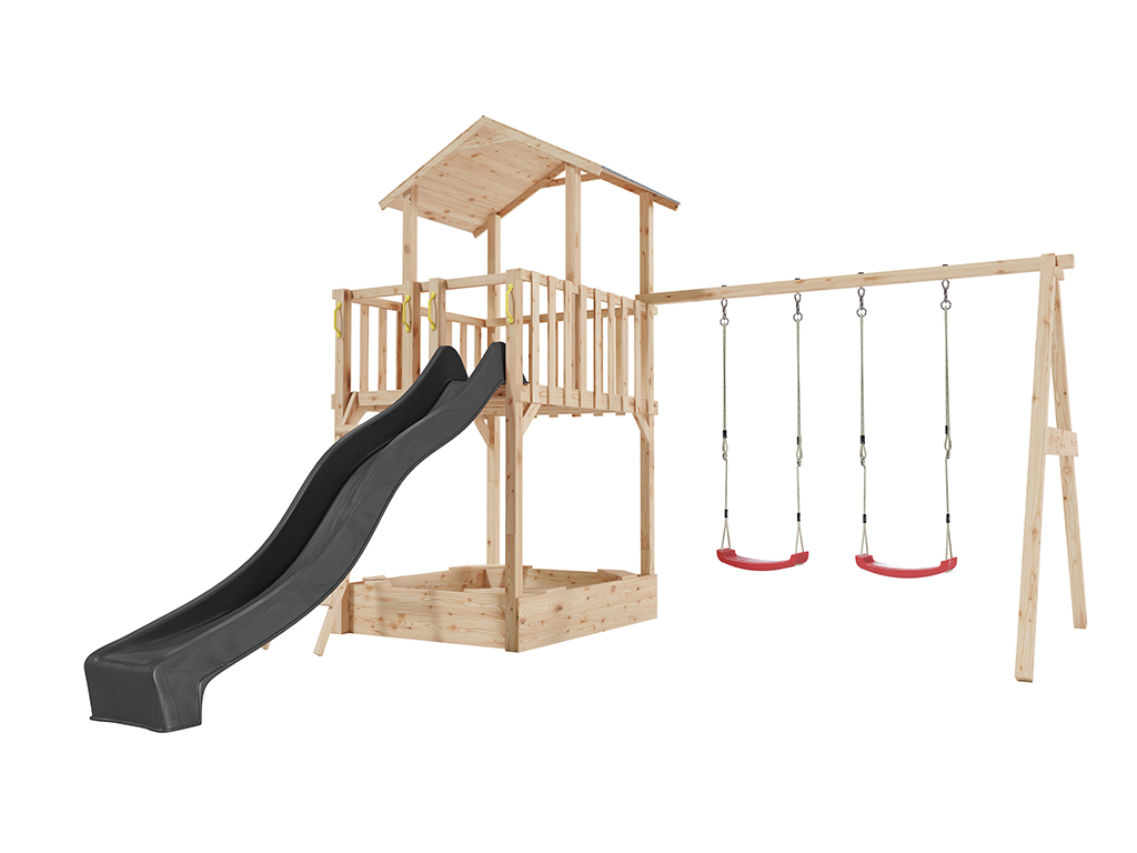 | Lieferumfang: | Spielturm Tilly Premium Lärche, Doppelschaukel (ohne Schaukelsitze), 4 Schaukelhaken, Sandkasten, Wellenrutsche |