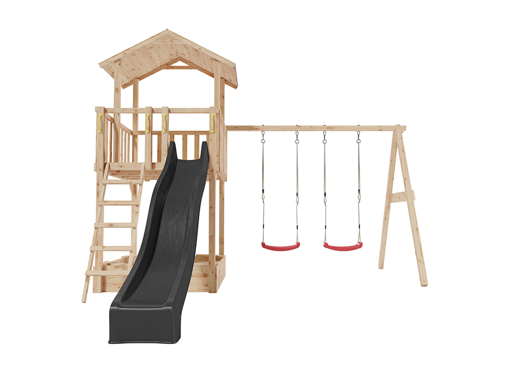Die großzügige und zum Teil überdachte 145 cm hohe Plattform wird über eine stabile Leiter mit aufgesetzten Holzsprossen erreicht. Für die Sicherheit deines Kindes sind bereits vier Haltegriffe im Lieferumfang enthalten. - Inkl. Doppelschaukel