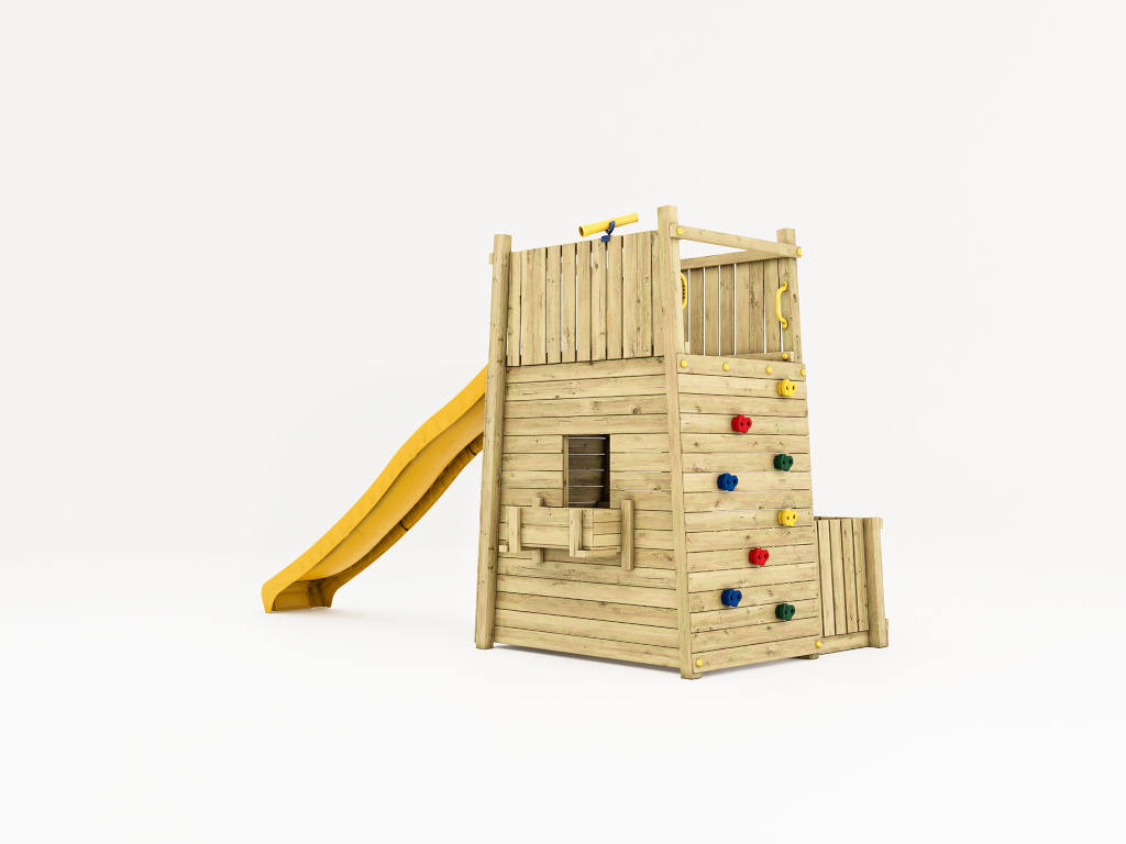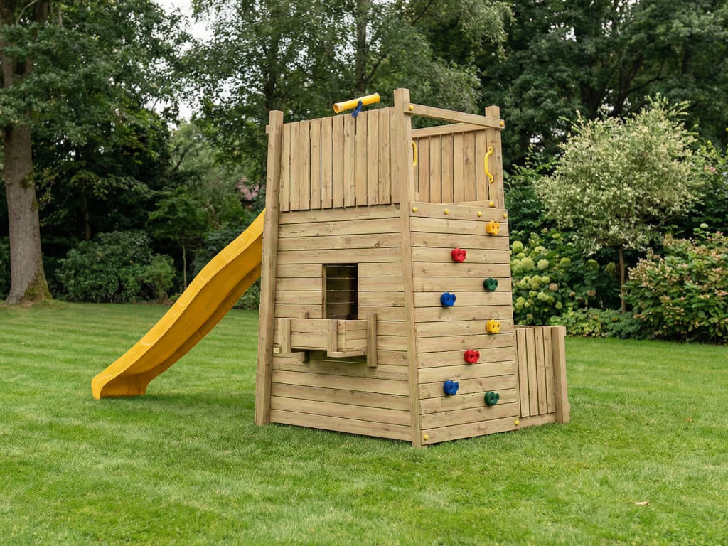 | Lieferumfang: | Spielturm, 4x Haltegriff, 4x Bodenanker, 8 bunte Klettersteine, 1x Spielteleskop, Rutsche |