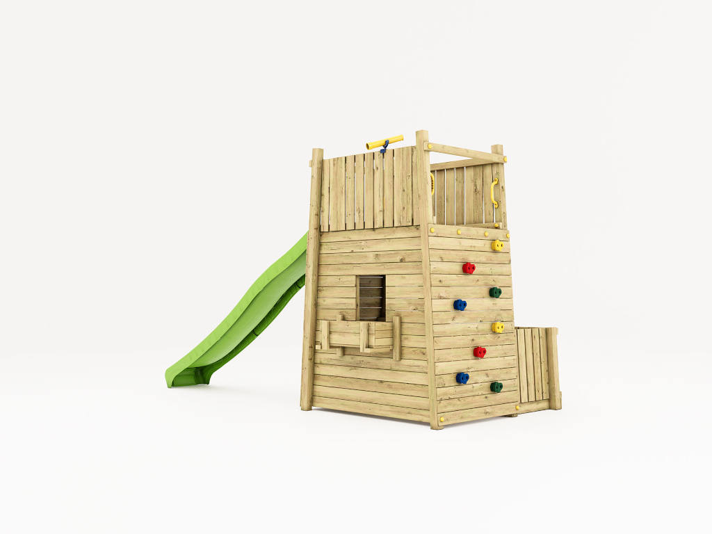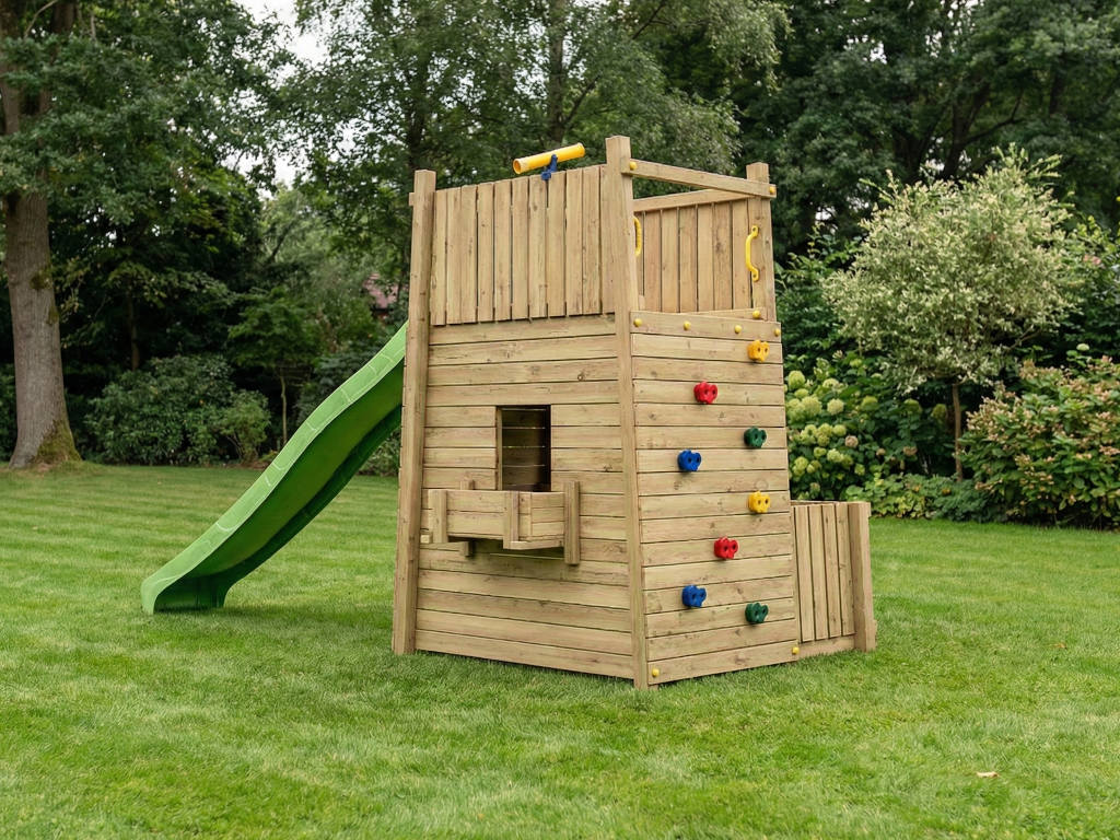 | Lieferumfang: | Spielturm, 4x Haltegriff, 4x Bodenanker, 8 bunte Klettersteine, 1x Spielteleskop, Rutsche |