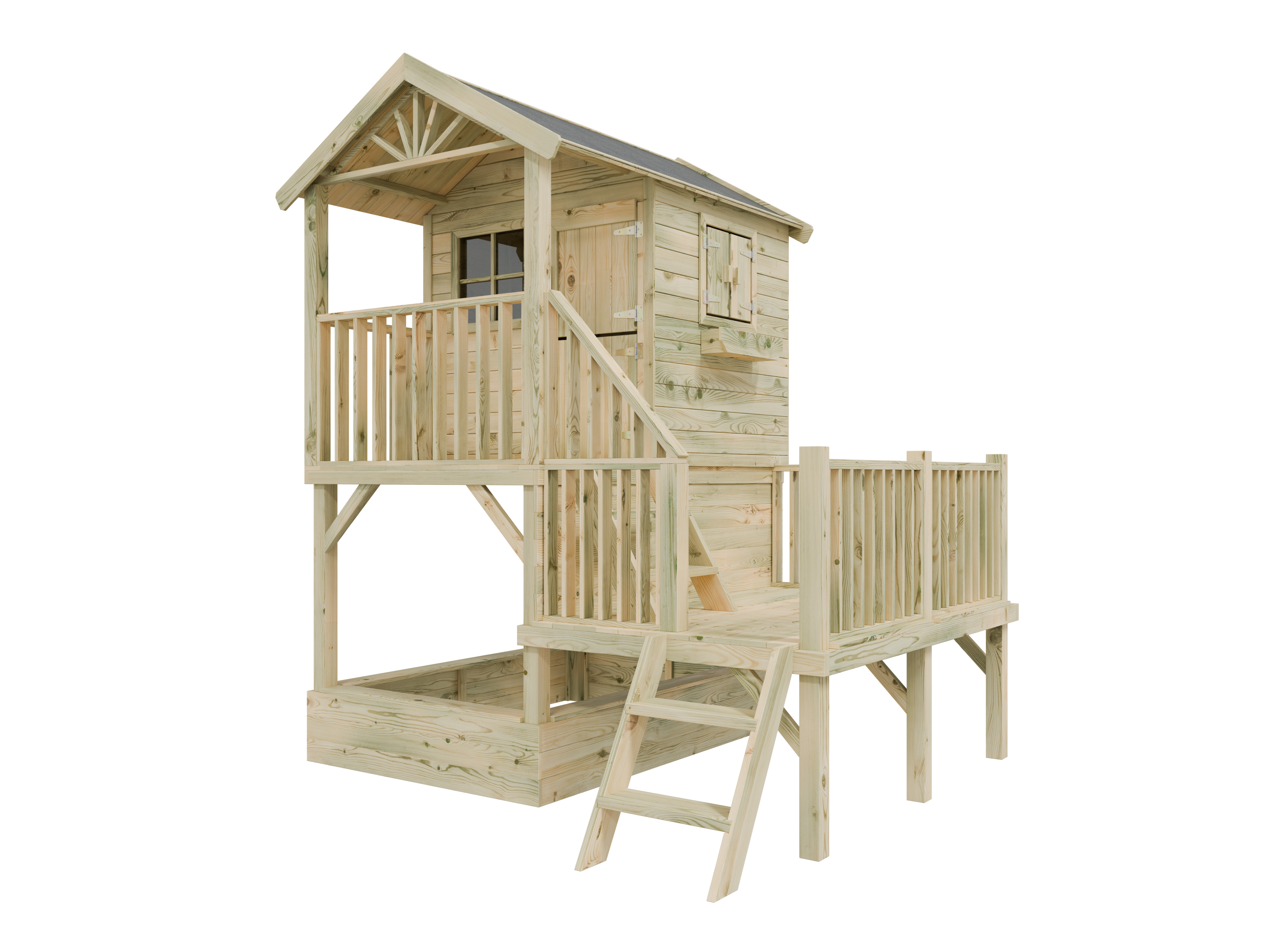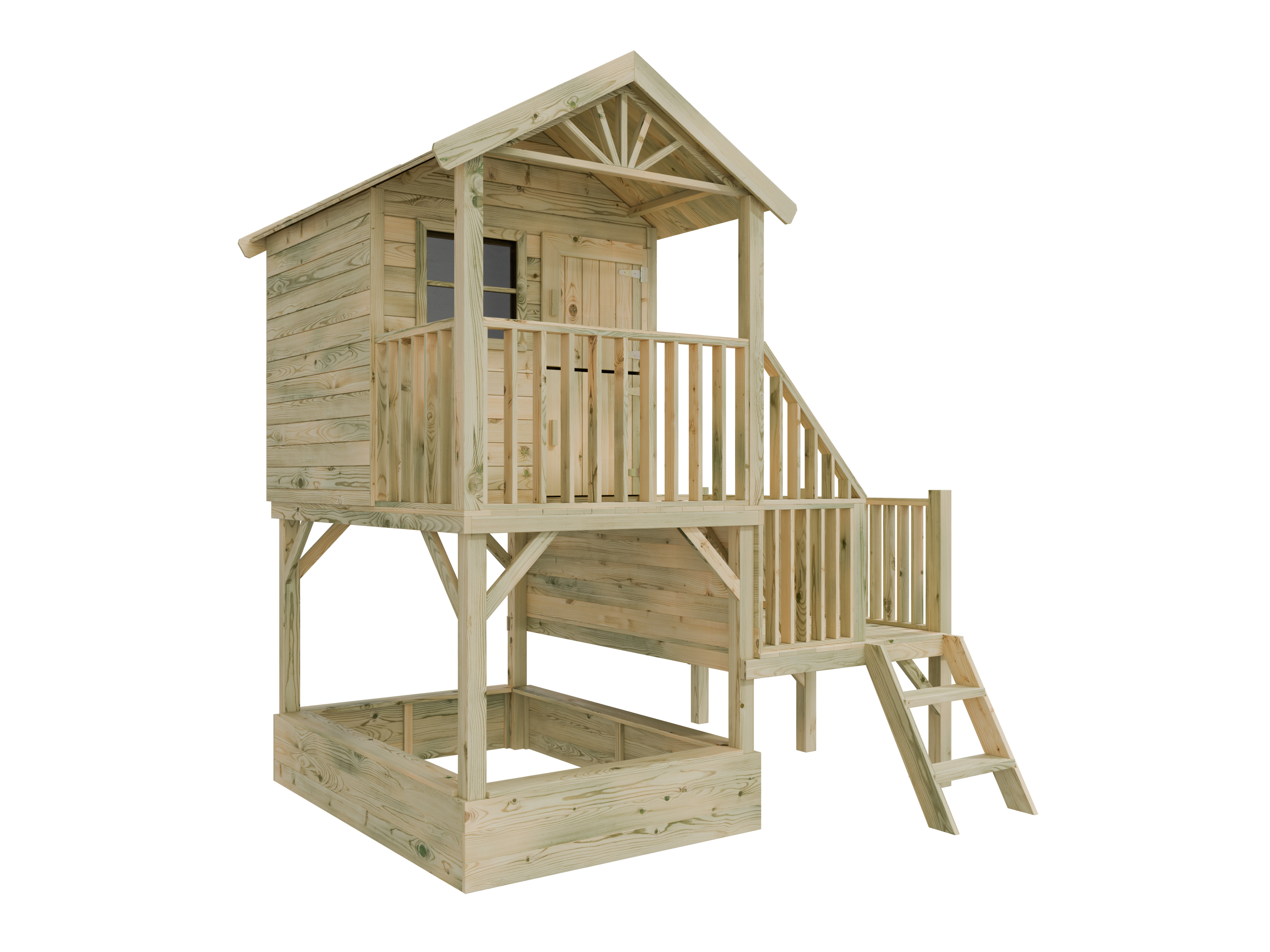 Das Stelzenhaus mit großzügiger Veranda ist mit einem nach außen zu öffnenden Fenster mit Fensterläden in der Seitenwand und einem feststehenden Kunstglasfenster in der Front ausgestattet. Ein Blumenkasten ist ebenfalls enthalten. Das Spielhaus bietet genug Platz für mehrere Kinder und lässt sich ganz nach der Vorstellung der Kleinen durch z.B. eine Kinderküche erweitern.