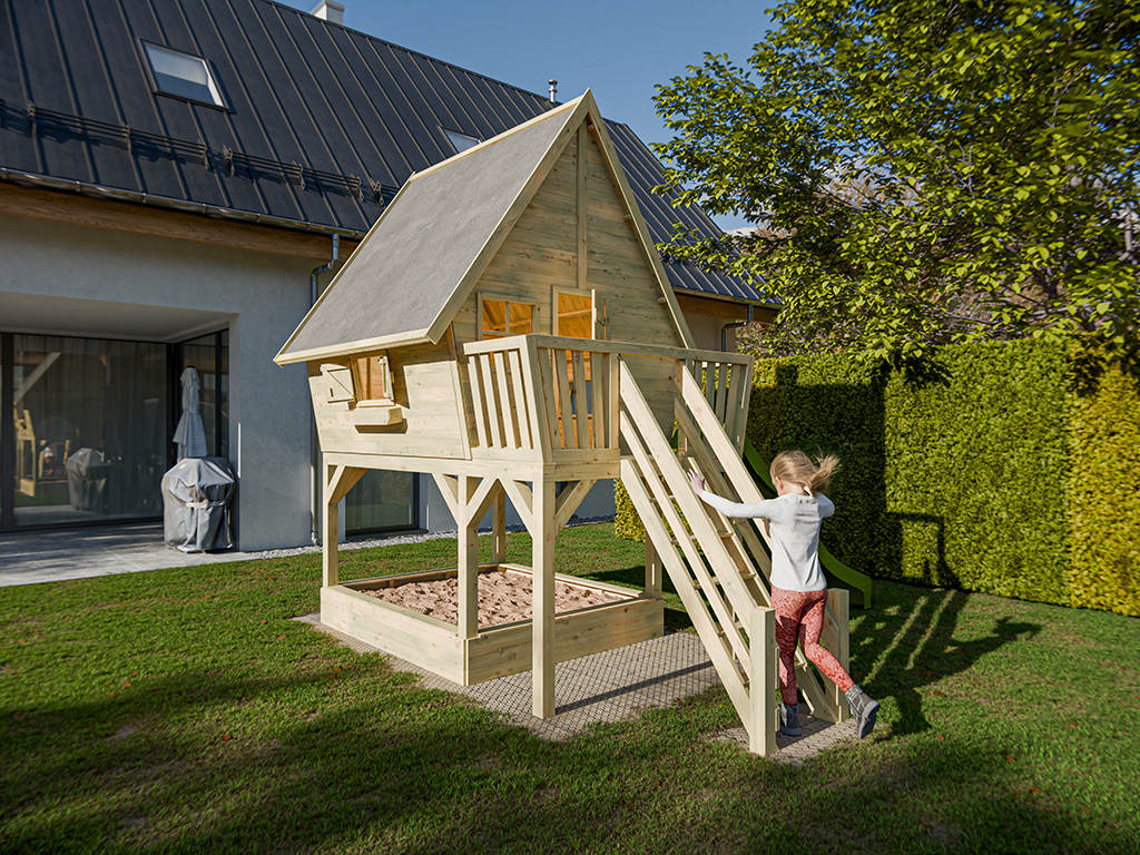 Unter dem Stelzenhaus befindet sich ein großer Sandkasten inkl. vier Sitzbrettern. - Inkl. 140 cm Podest und Rutsche