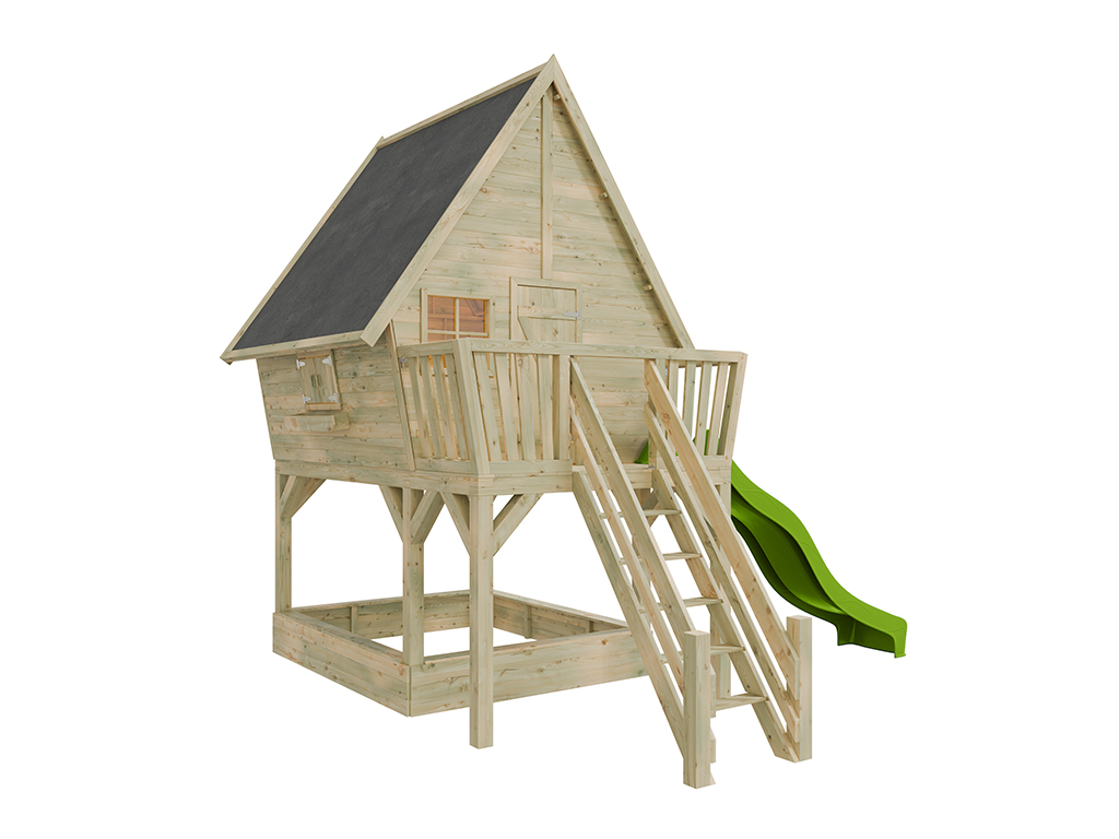 Unter dem Stelzenhaus befindet sich ein großer Sandkasten inkl. vier Sitzbrettern. - Inkl. 140 cm Podest und Rutsche