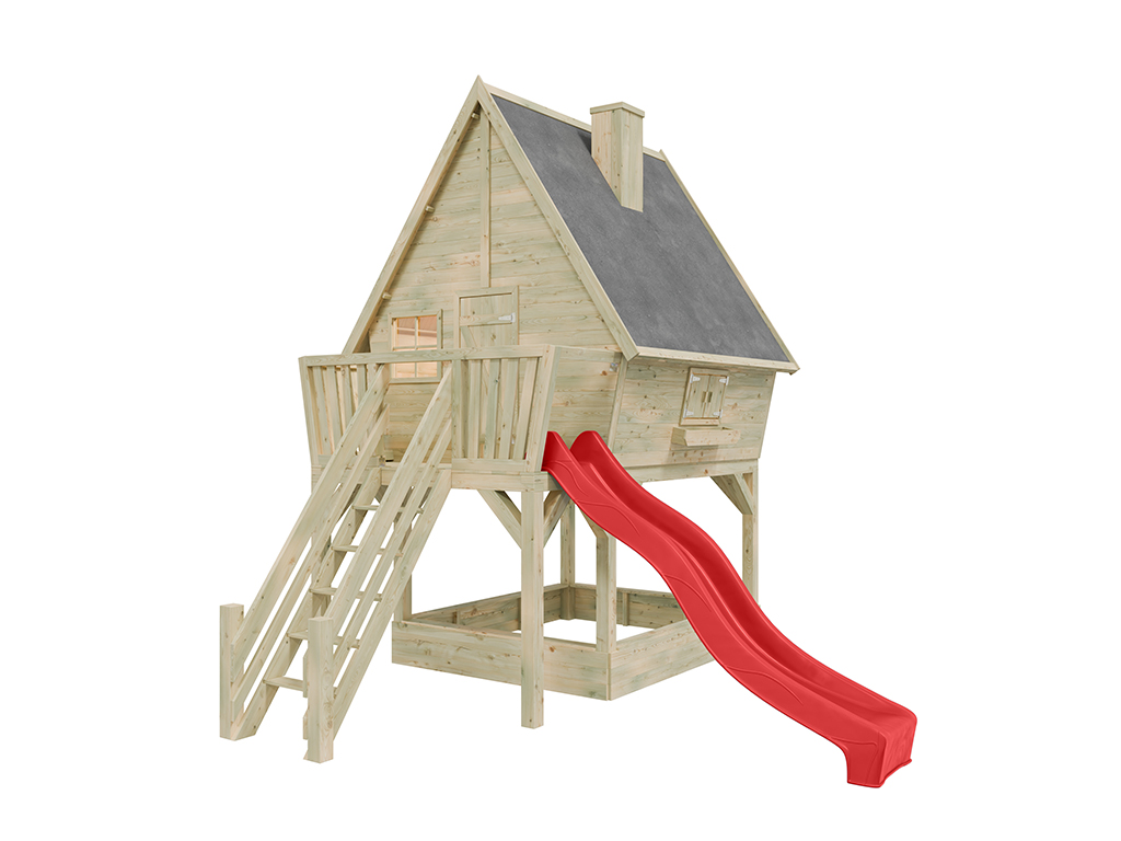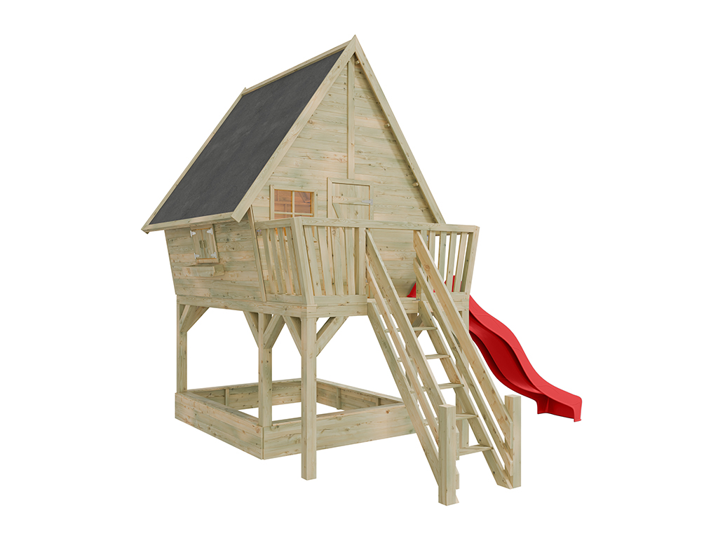 Stelzenhaus Funny XXL mit Sandkasten KDI inkl....B x T x H: 201 x 188 x 303 cm, inkl. 2 Fenster + Blumenkasten, inkl. Rutsche rot + Sandkasten