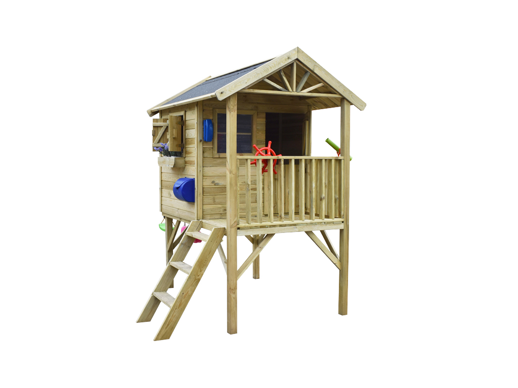 Das Stelzenhaus wird mit Einzeltür, 2 Fenstern, Treppe und einem Blumenkasten geliefert und sorgt für großes Spielvergnügen bei den Kindern.