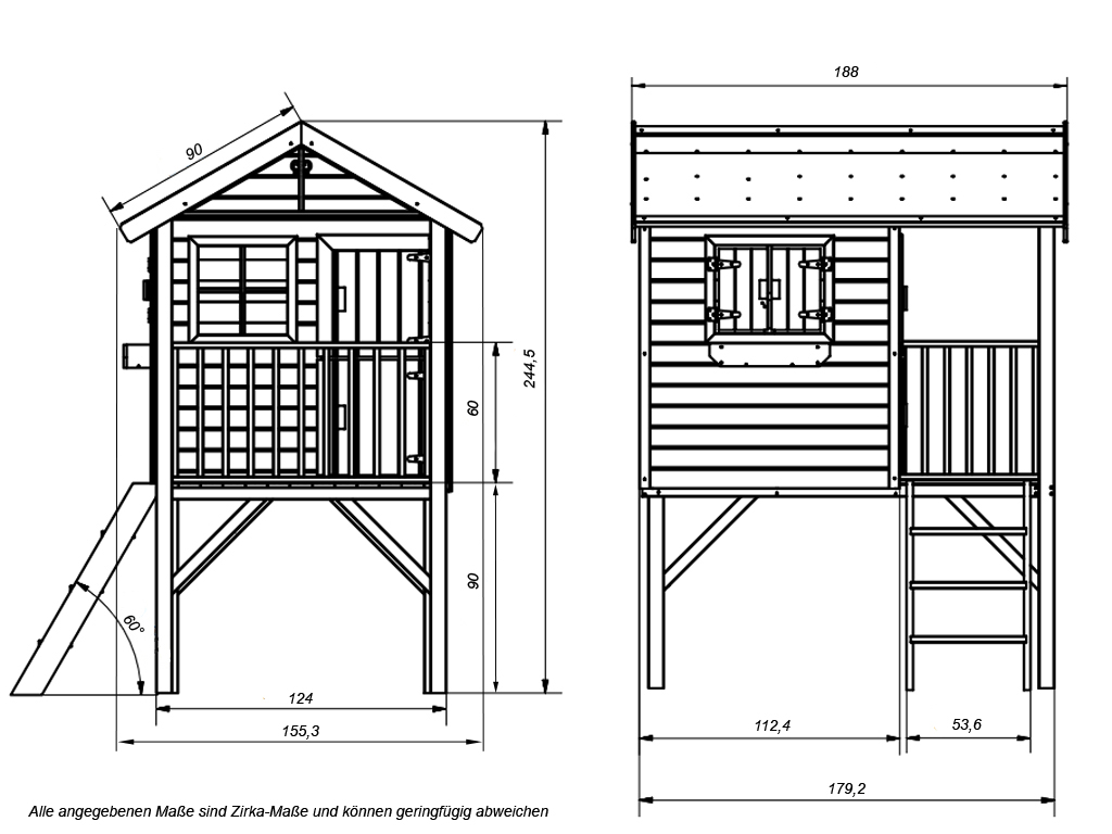 B x T x H: 155,3 x 188 x 244,5 cm, 90 cm Podest, 2 Fenster, inkl. Treppe + Blumenkasten