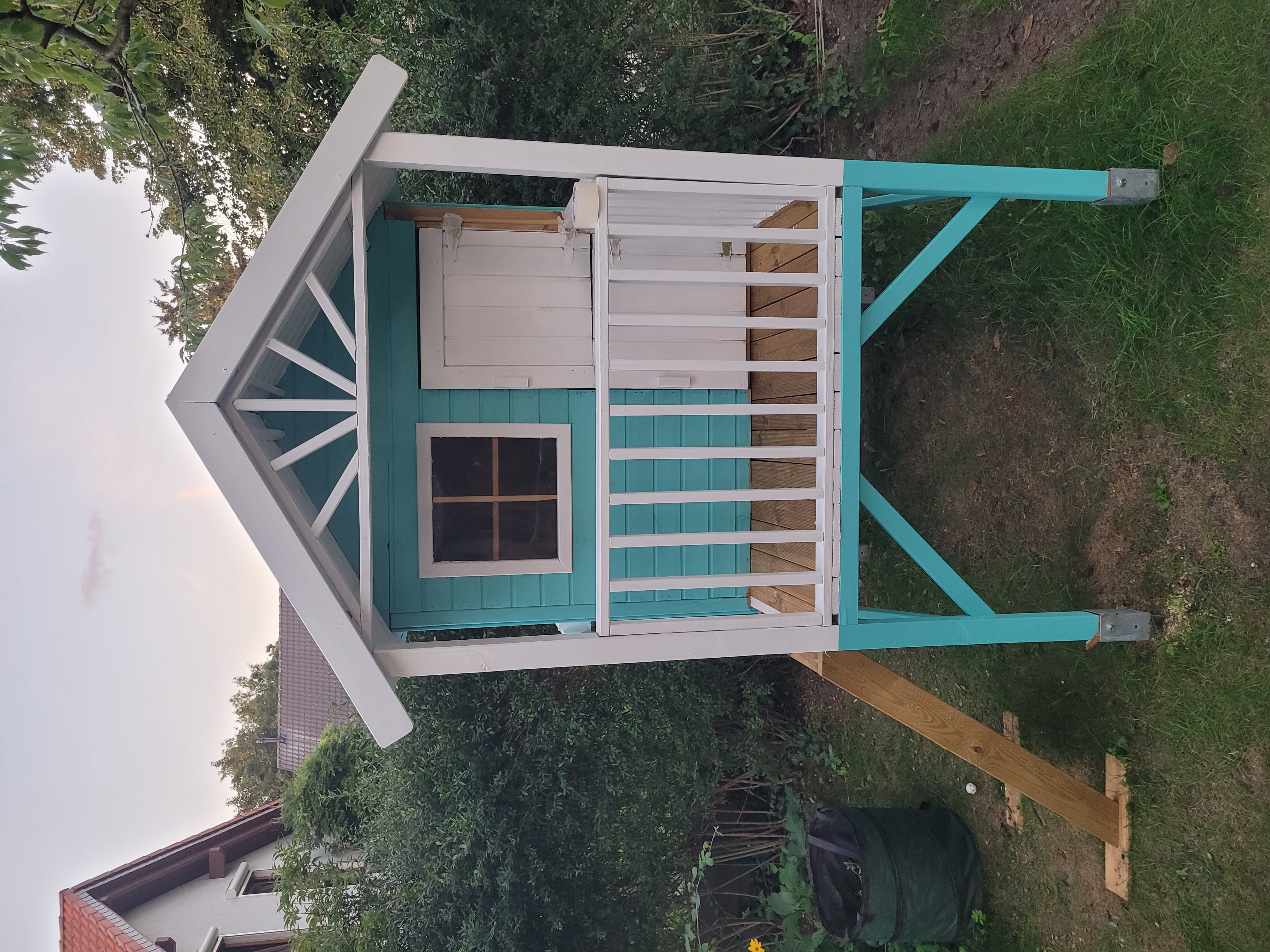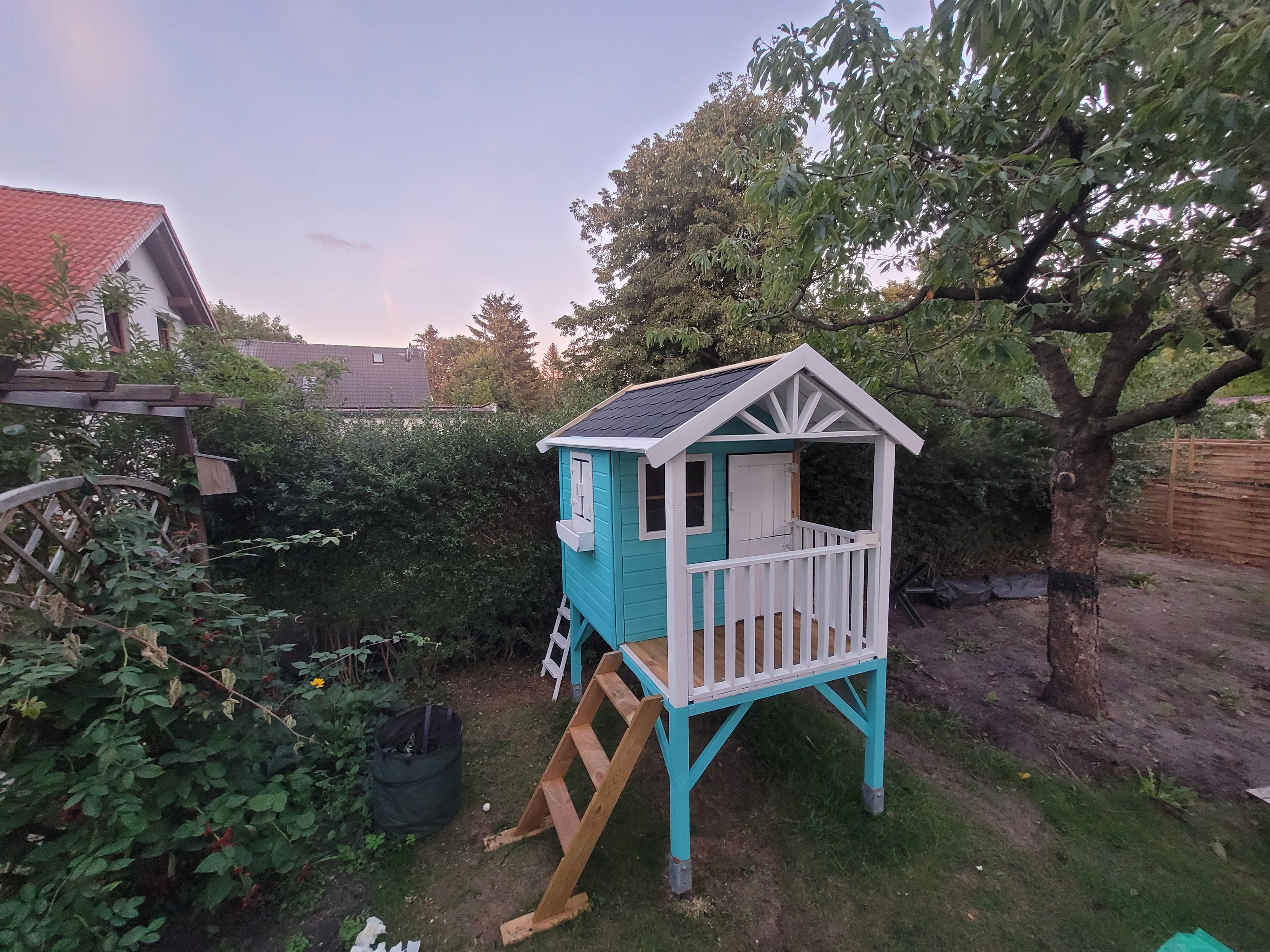 Die Lieferung war schneller als erwartet, jedoch wurden wir nicht von der Spedition kontaktiert. Wäre ich nicht zufällig zu Hause gewesen, wäre das schief gelaufen. Qualität ist gut für den Preis. Hier und da haben wir noch nachgeschliffen und auch das ganze Haus mit wetterfarbe bepinselt. Wir haben unsere alte Rutsche an ein Ende angebaut und haben das Haus auf alte holzpfosten höher gesetzt. So hat nun auch die matschküche ihren Platz gefunden und die Kids können problemlos drunter stehen. Wir haben auch unsere alte Holztreppe vom alten spielturm verwendet. Sieht echt toll aus und unsere Kleine ist echt happy