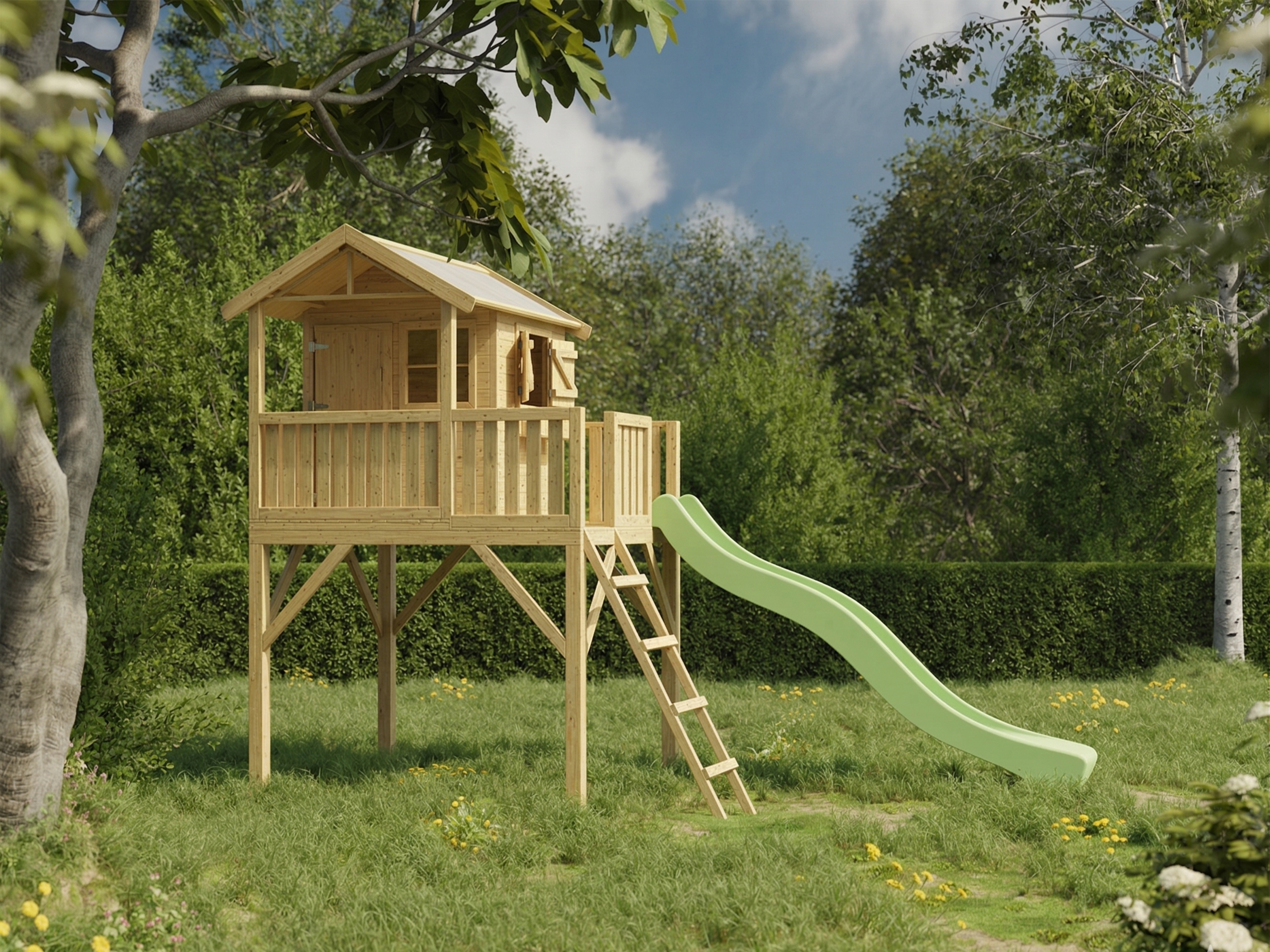 Stelzenhaus Funny XXL mit Sandkasten KDI inkl....B x T x H: 201 x 188 x 303 cm, inkl. 2 Fenster + Blumenkasten, inkl. Rutsche grün + Sandkasten