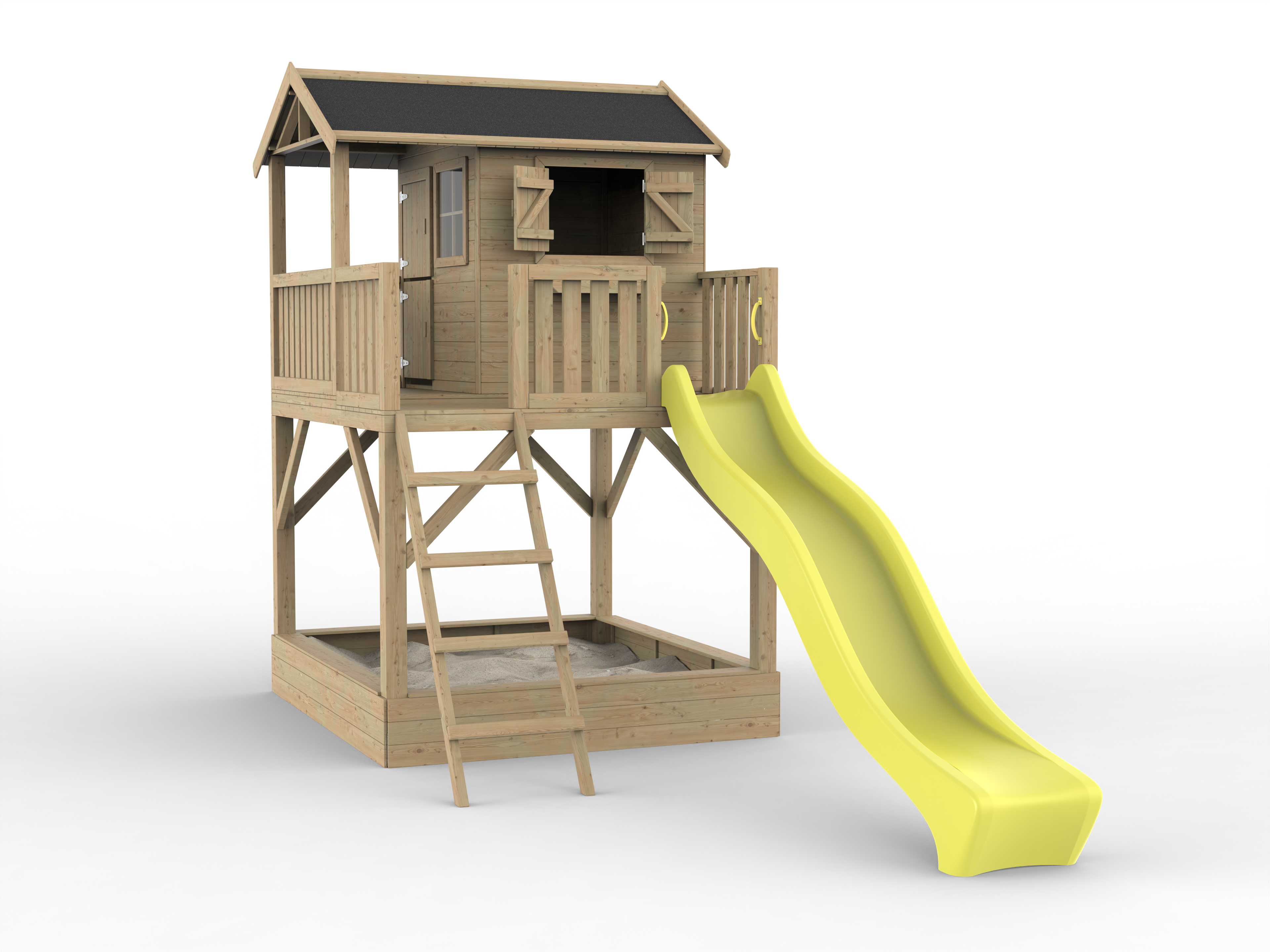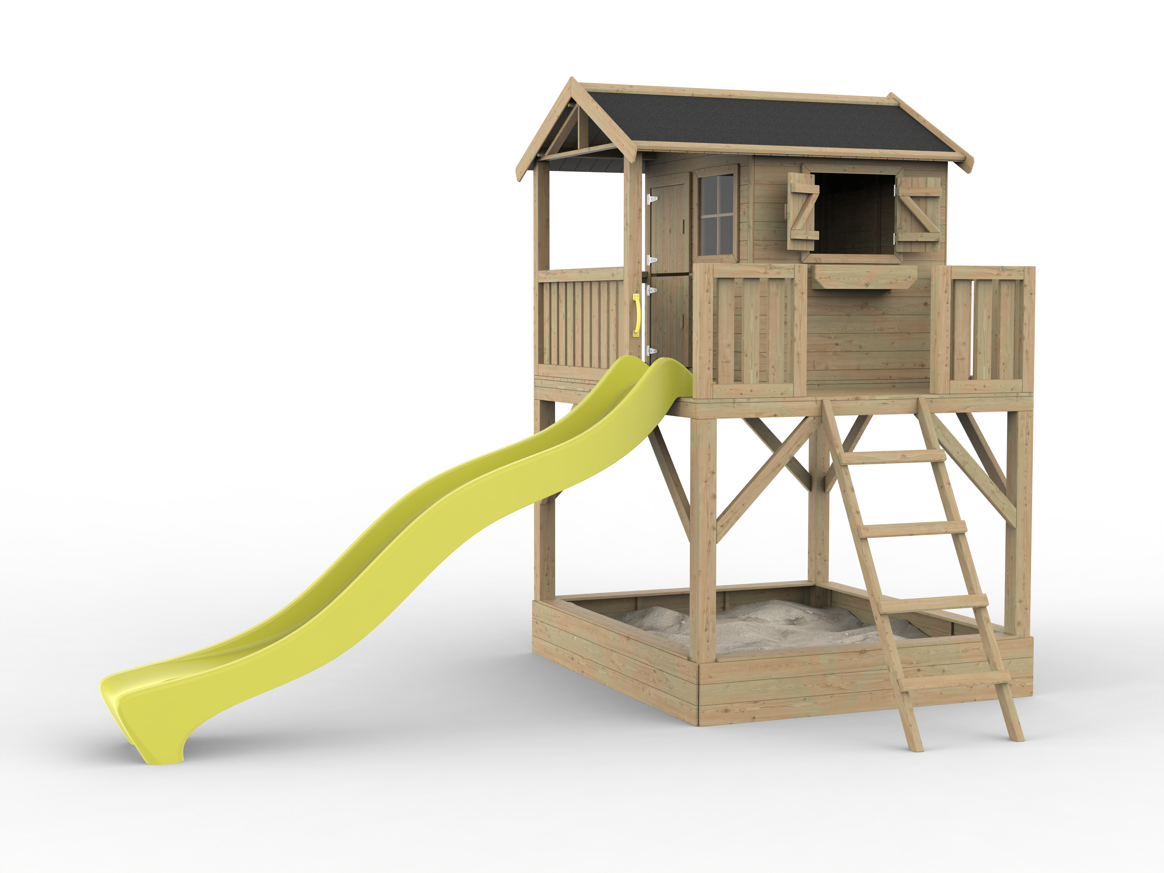 | Lieferumfang: | Stelzenhaus Funny XXL, Blumenkasten, Fensterläden, Veranda, Balkon, detaillierte Montageanleitung, Rutsche gelb |